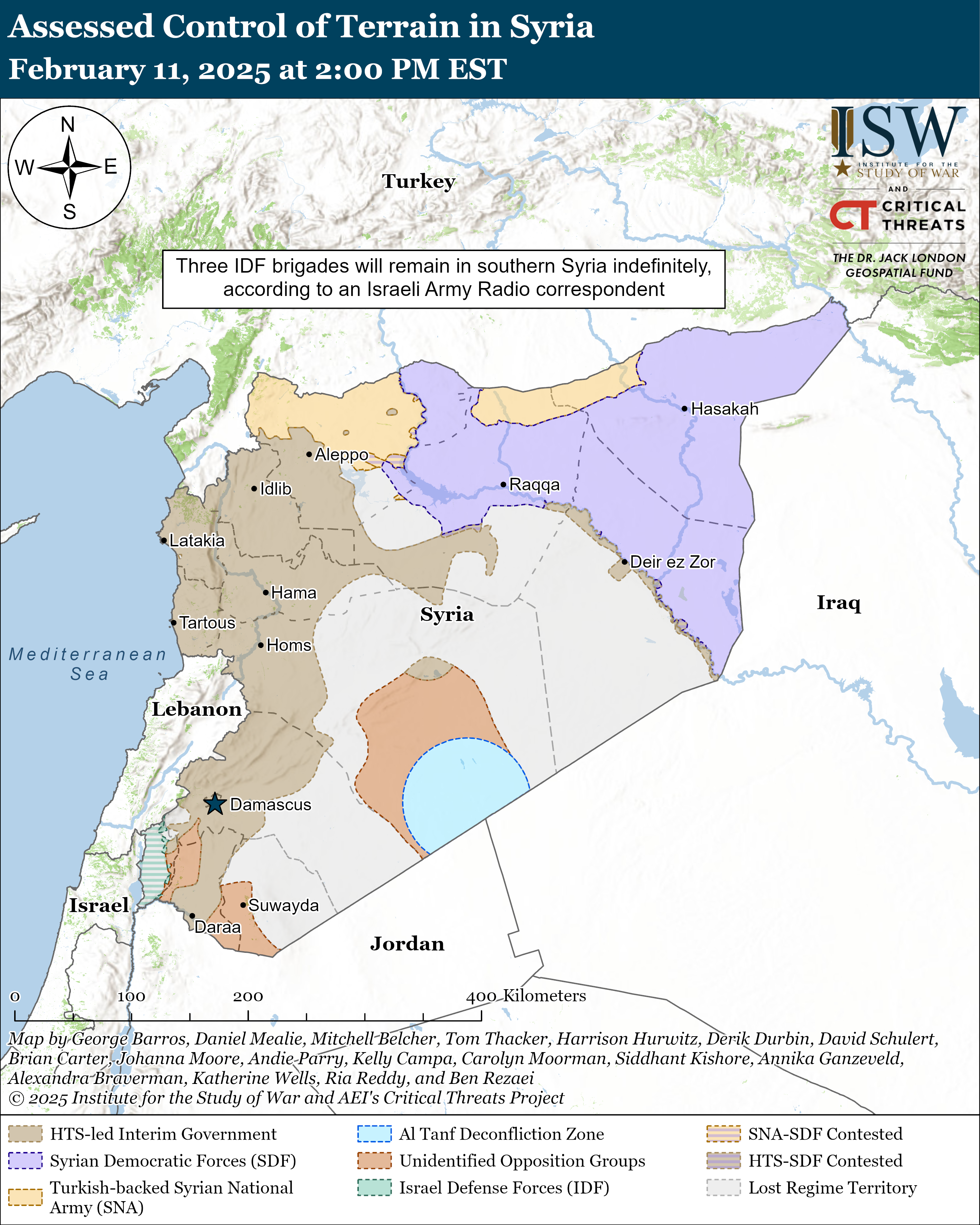 Lebanese media reported on February 11 that HTS-led Syrian interim government forces sent reinforcements to three locations along the Syria-Lebanon border.[35] HTS-led forces deployed to the Syria-Lebanon border on February 6 after smugglers kidnapped HTS fighters during a counter-smuggling operation.[36] HTS-led forces and smugglers have clashed near the border since February 6.[37] Lebanese media reported that the Lebanese Armed Forces closed the Qald al Sabaa border crossing between Lebanon and Syria on February 11.[38]