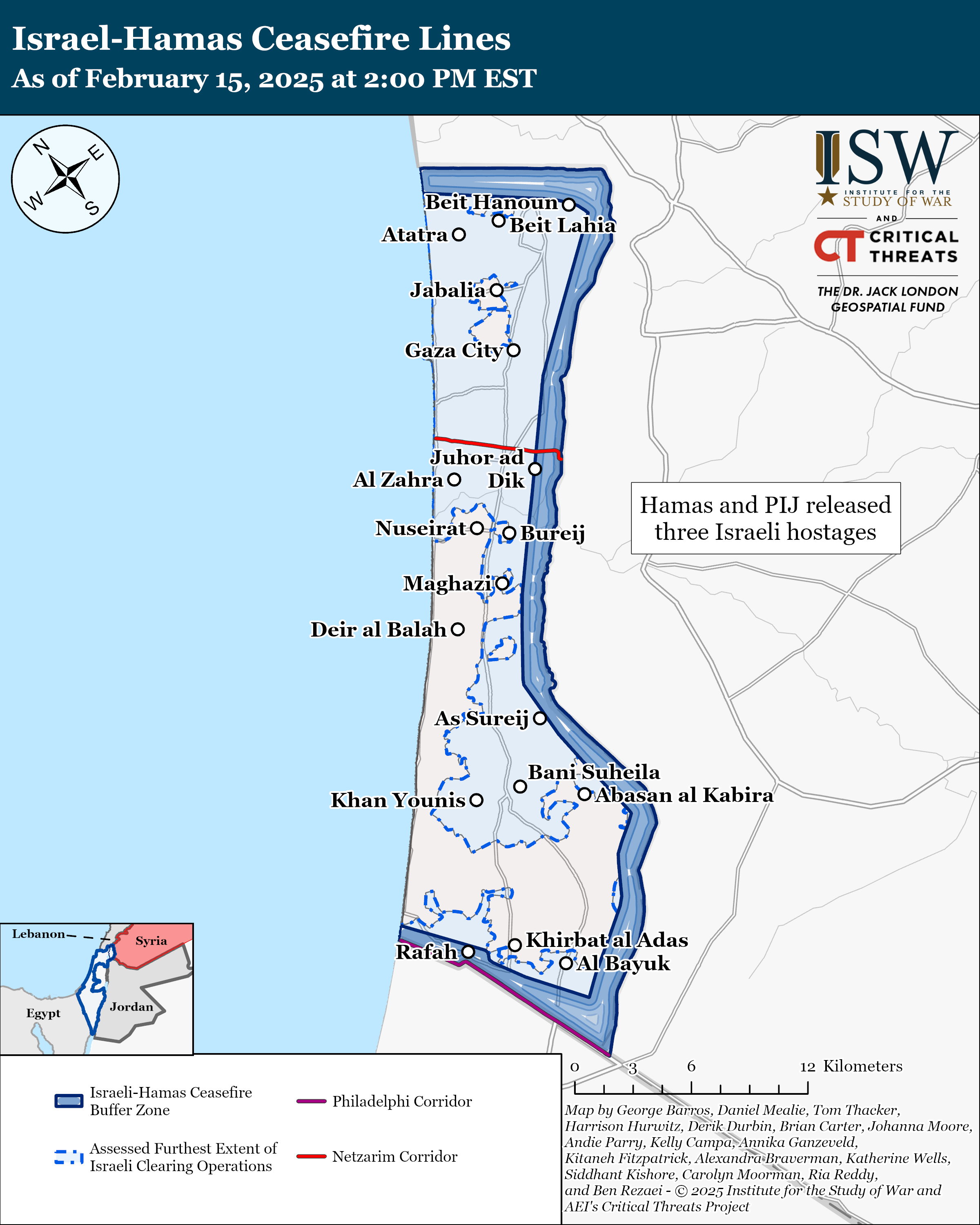 Hamas and Palestinian Islamic Jihad (PIJ) released three Israeli hostages on February 15.[18] Hamas transferred the hostages to the International Committee of the Red Cross in Khan Younis in the southern Gaza Strip.[19] Israel released 369 Palestinian prisoners in exchange, including 111 whom the Israel Defense Forces (IDF) detained in the Gaza Strip during the October 7 War.[20] BBC reported that Israel will deport an unspecified number of Palestinian prisoners to Egypt.[21]