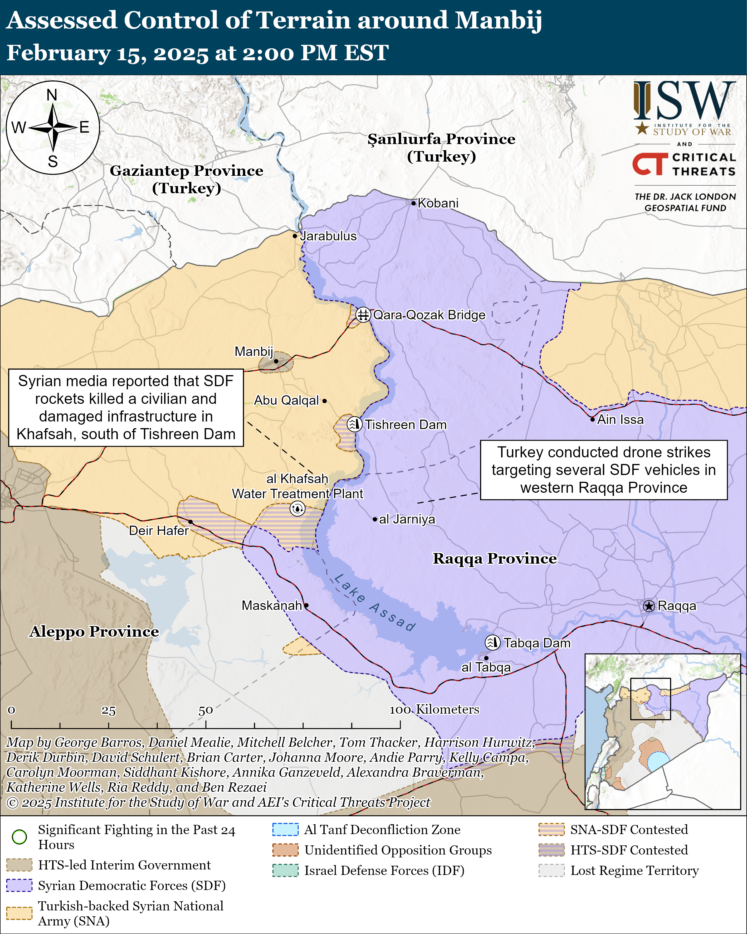 Turkey conducted drone strikes targeting several SDF vehicles in western Raqqa Province on February 15. Several anti-SDF outlets reported that Turkish drones struck two SDF vehicles in al Jarniyah and killed an unknown number of SDF members inside.[25] Anti-SDF media also reported that a Turkish drone later struck an SDF vehicle in the adjacent Mazyouna village and killed three SDF members.[26] Mazyouna is located along a key supply line from Raqqa to Tishreen Dam. Turkey has repeatedly targeted the SDF supply line since late December 2024 to try to isolate the SDF around Tishreen Dam.[27]