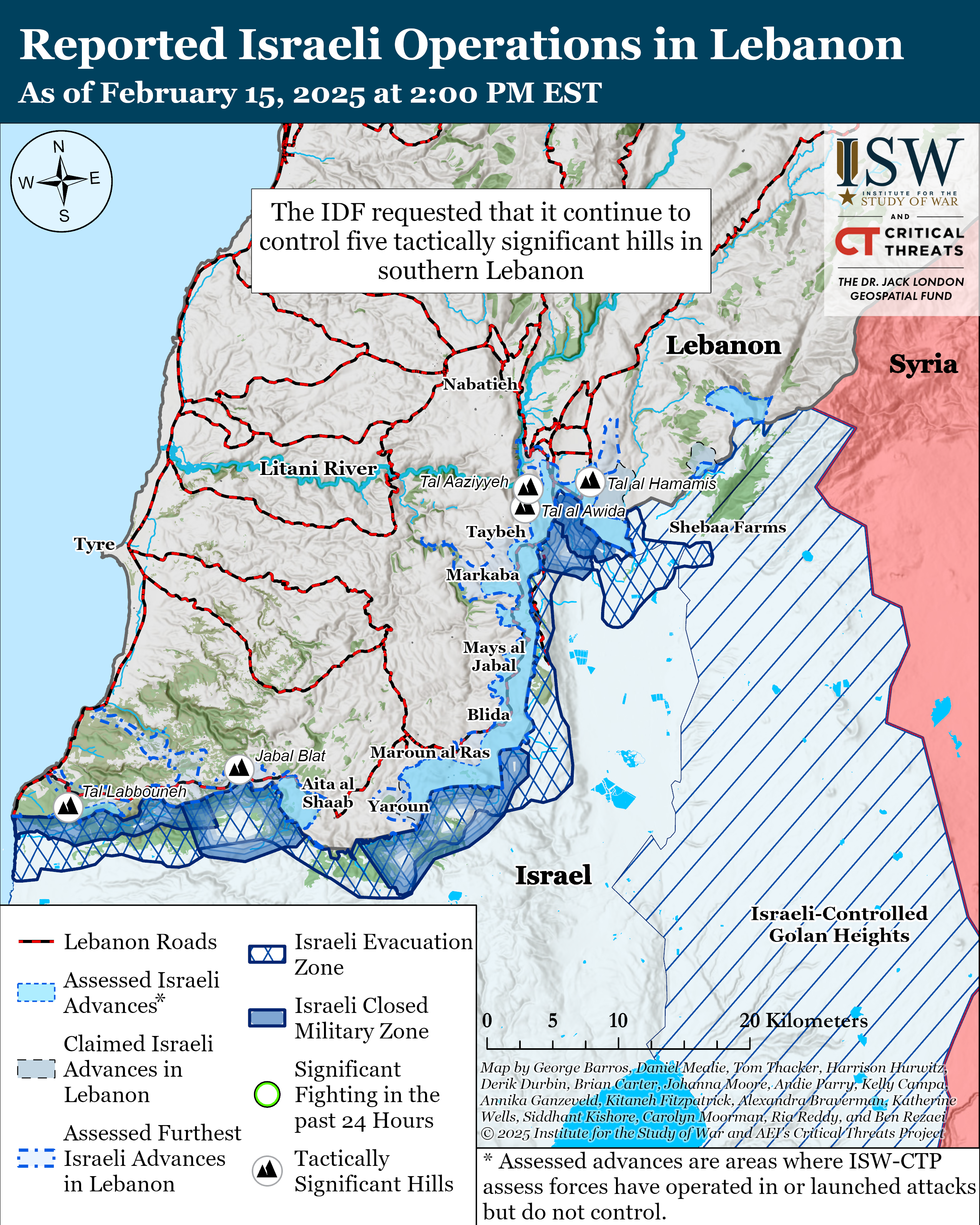 - Tal al Hamamis, south of Khiam, Lebanon. Tal al Hamamis is located approximately one kilometer from the Blue Line and provides a view of Metula, Israel, from the north.[15] Hezbollah media reported on February 14 and 15 that the IDF constructed bunkers and barriers on Tal al Hamamis.[16] CTP-ISW previously noted that Tal al Hamamis would have strategic significance to the IDF because control over Tal Hamamis would prevent Hezbollah from using the elevated terrain to conduct direct fire or support indirect fire attacks into the Upper Galilee from there.[17]