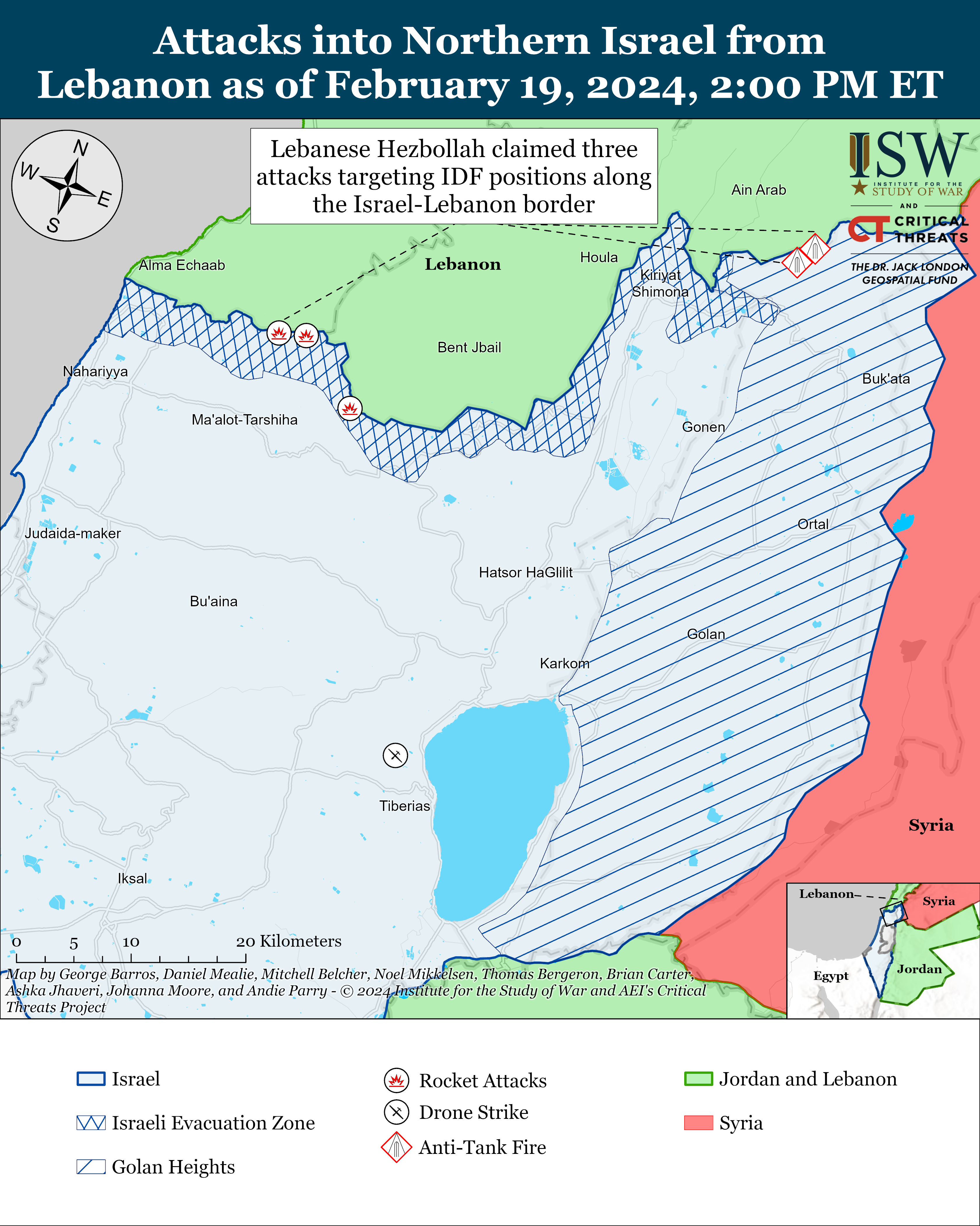 Iranian-backed militias, including Lebanese Hezbollah, conducted six attacks from southern Lebanon into northern Israel on February 19.[44] Lebanese Hezbollah claimed three attacks targeting IDF positions along the Israel-Lebanon border.[45]