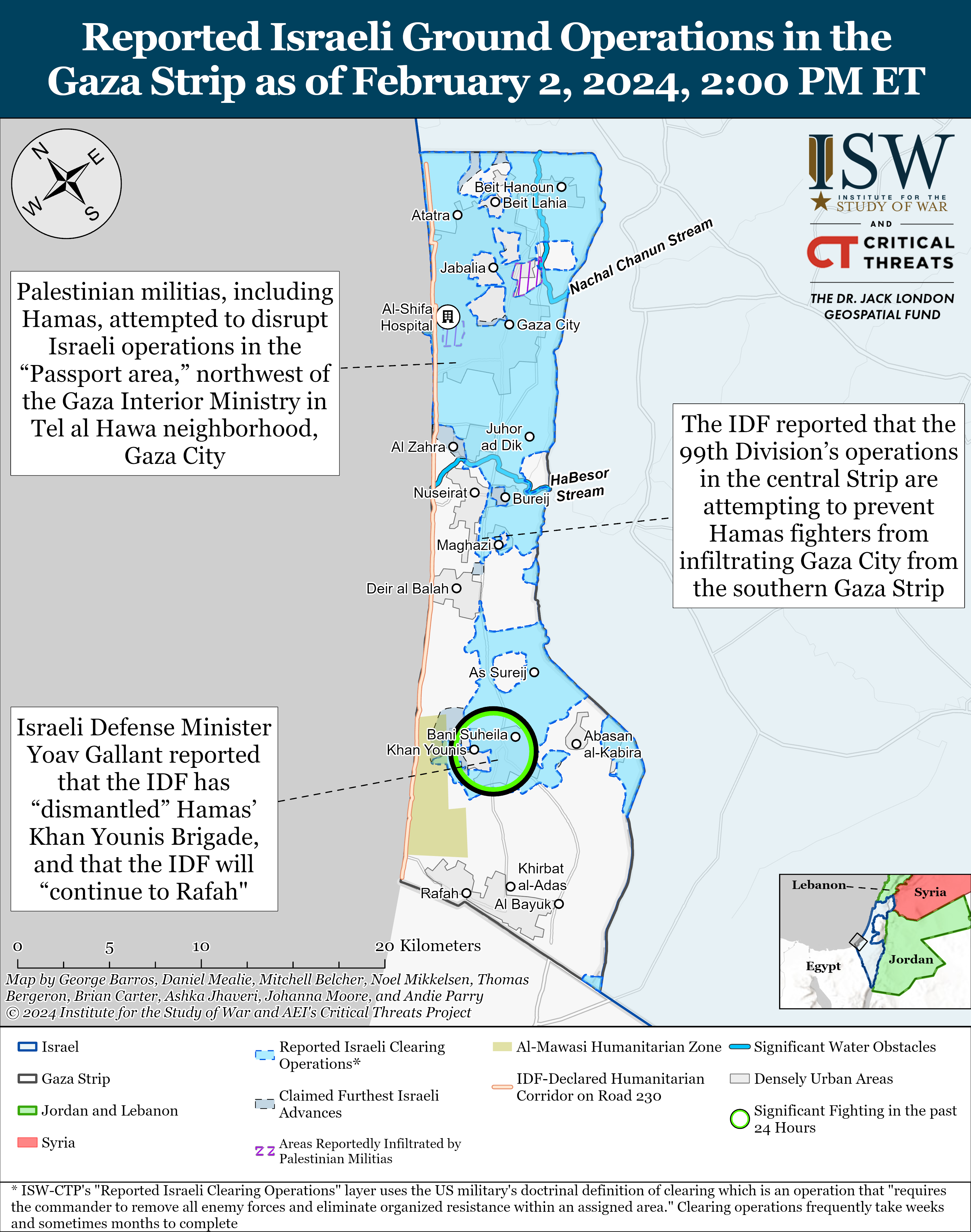 Palestinian militias, including Hamas, attempted to disrupt Israeli operations in the “Passport area,” northwest of the Gaza Interior Ministry in Tel al Hawa neighborhood, Gaza City on February 2. Hamas’ military wing claimed two attacks targeting Israeli forces operating in the area.[16] The IDF conducted an airstrike targeting the Gazan Interior Ministry on January 31.[17] Hamas controls the Gazan Interior Ministry. The ministry’s Internal Security Forces are comprised of Hamas al Majd operatives who target supposed “collaborators” with the Israeli state.[18] Turkish state-controlled media reported that the Internal Security Forces continued to operate in the northern Gaza Strip during Israeli ground operations.[19] The al Majd has continued to warn Gazans against accidentally engaging with Israeli security officials and issued periodic reminders about operational security during the ground operation.[20]