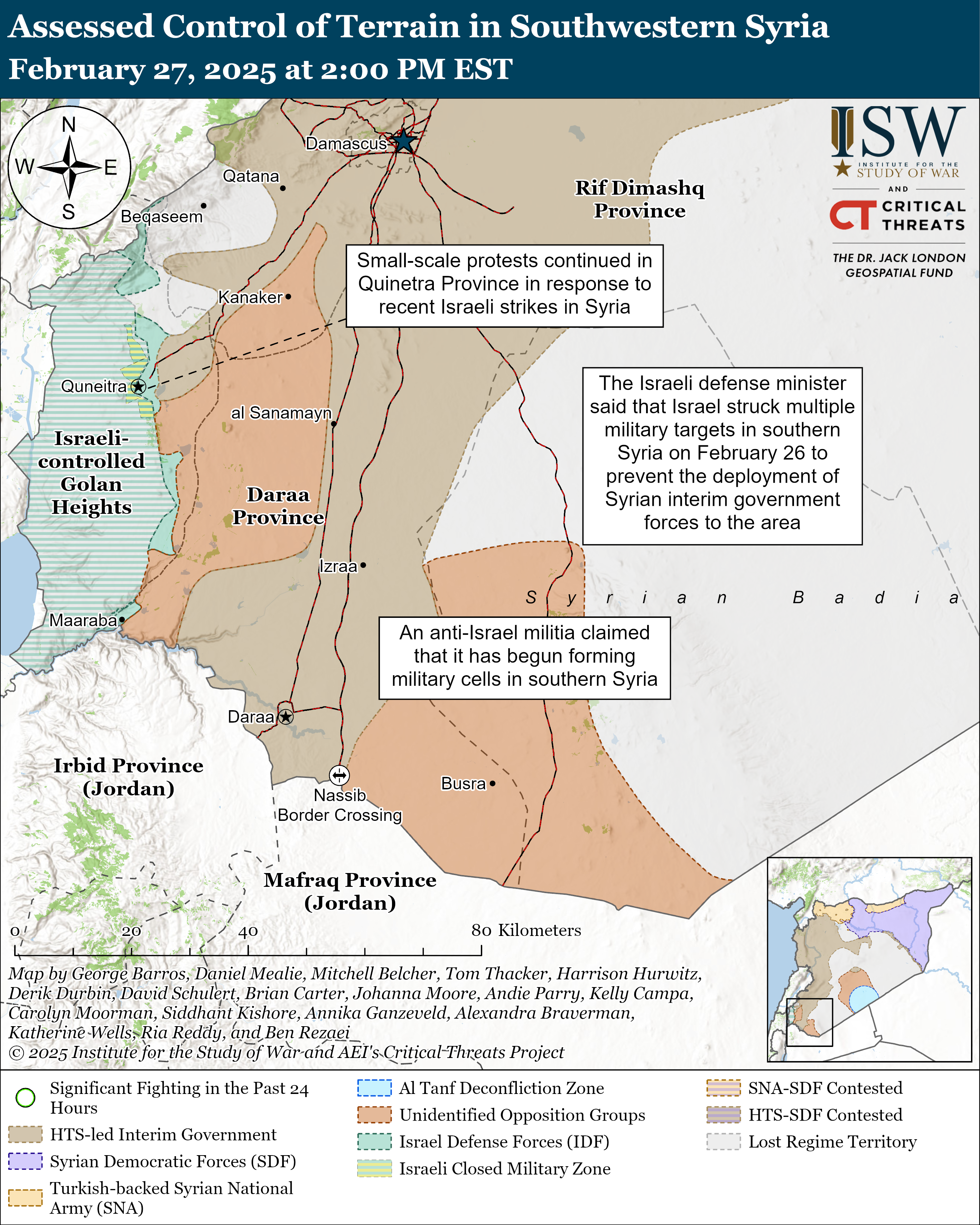 Anti-Israeli militias using iconography consistent with Iranian Islamic Revolutionary Guards Corps-backed militias announced that they have begun organizing military forces to resist Israeli forces in southern Syria. Anti-Israel militia, the Islamic Resistance Front in Syria-the First of the Brave, said on February 27 that it has begun to form military cells in southern Syria.[29] The group’s iconography is consistent with the IRGC and other Iranian-backed groups that are part of the Axis of Resistance, including Kataib Hezbollah in Iraq and Lebanese Hezbollah. The use of the fist-and-Kalashnikov iconography is usually a very strong indicator that a group is aligned with or backed by the IRGC. The IDF Air Force launched a series of airstrikes on February 25 against various military targets in southern Syria.[30] Israeli Defense Minister Israel Katz said on February 27 that Israel struck to prevent the Syrian interim government from deploying forces in southern Syria.[31] Small-scale protests continued in Quintera Province on February 27 in response to the strikes.[32]