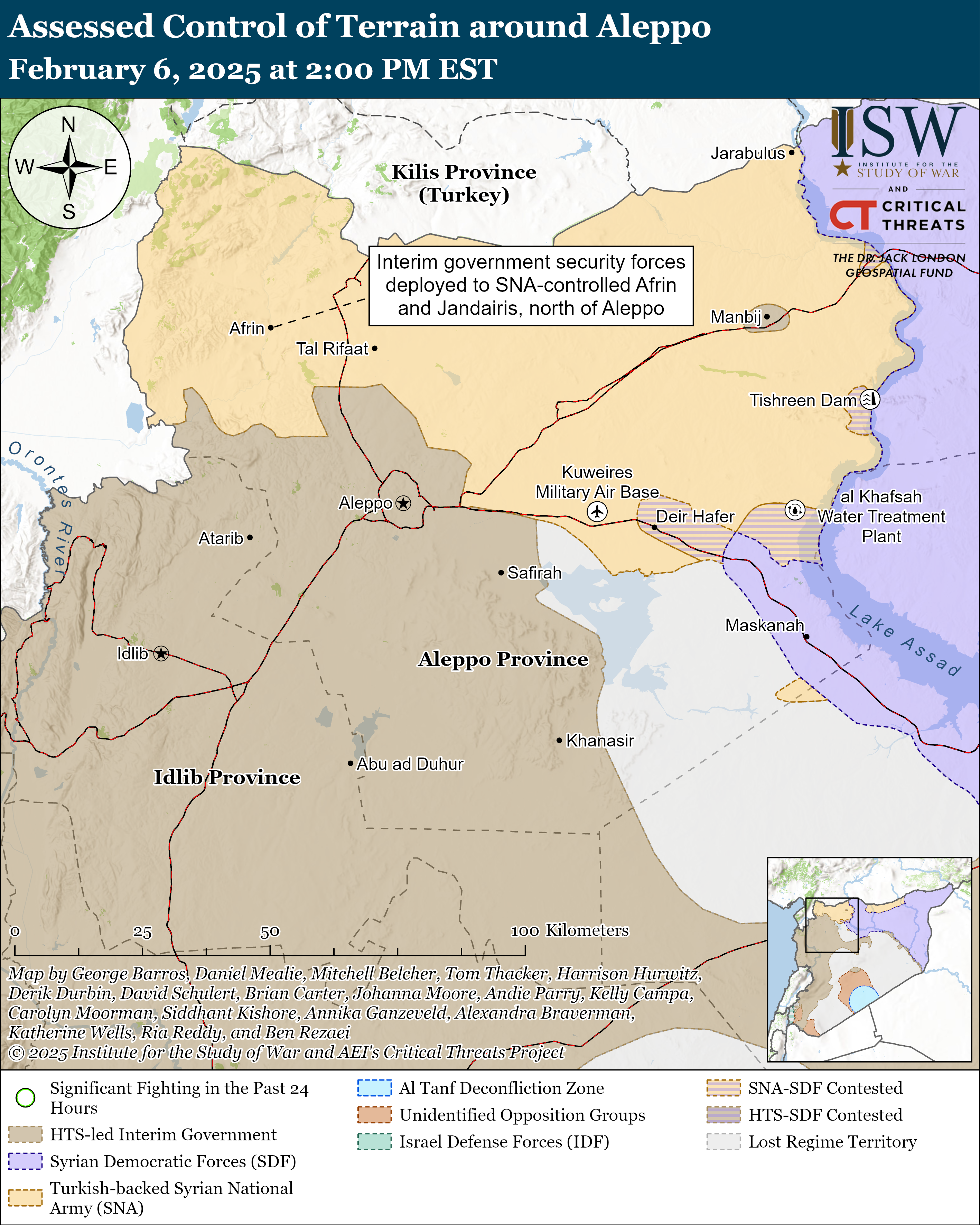 Syrian interim government forces have deployed to areas previously controlled by the Turkish-backed Syrian National Army (SNA) as armed factions have started to integrate into the new Syrian army and security apparatus. Interim government security forces deployed to Afrin and Jandairis, north of Aleppo, on February 6.[13] The SNA has controlled and administered these areas since 2018.[14] Kurdish media claimed that the interim government would take control of SNA territory and dismantle barracks and other military infrastructure in the area.[15] Interim government-affiliated Public Security forces deployed to checkpoints near the entrances to Manbij, Aleppo Province, on February 5, demonstrating that the deployment of interim government forces extends across SNA-controlled territory.[16]