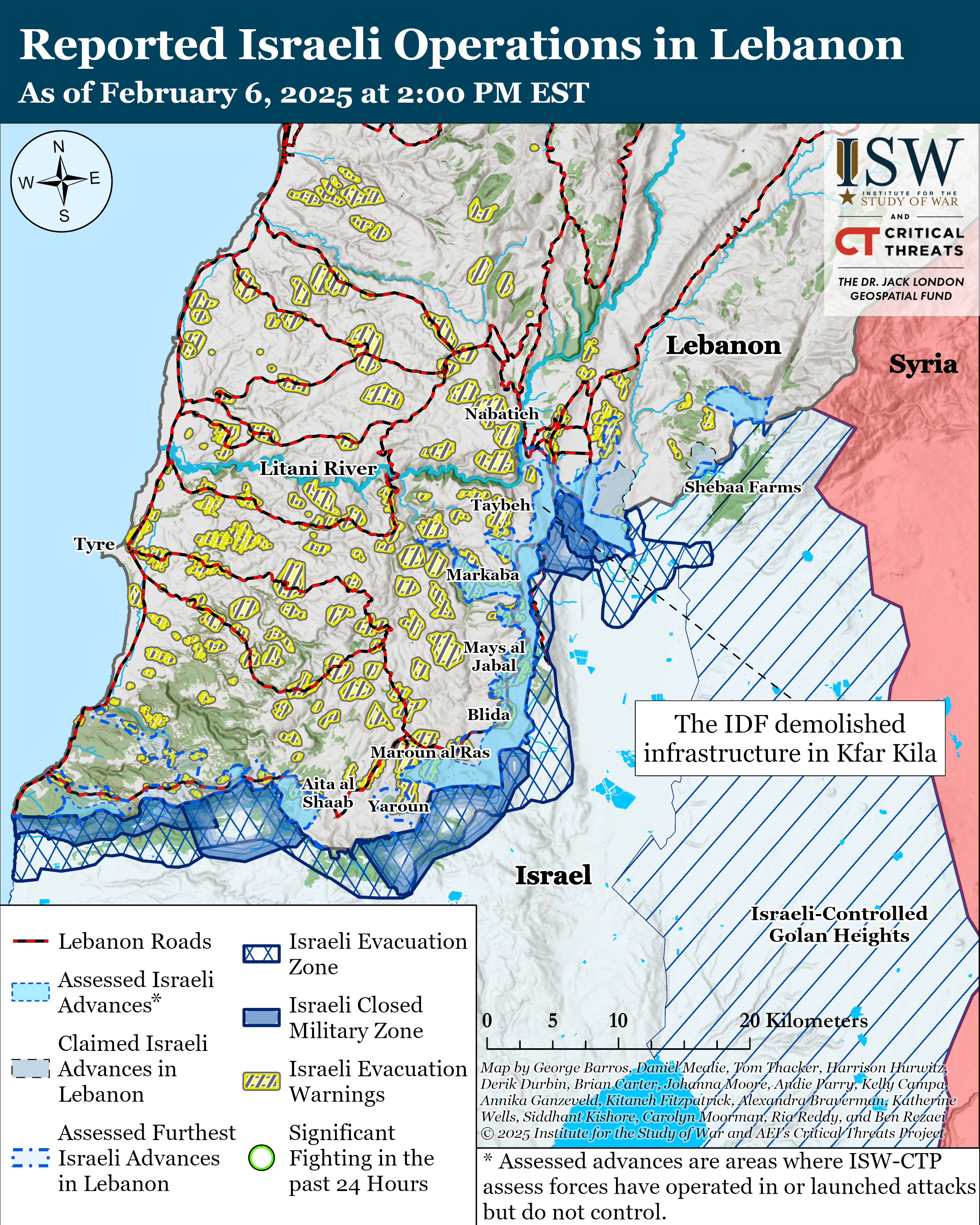 Lebanese media reported on February 6 that the IDF demolished infrastructure in Kfar Kila, southeastern Lebanon.[61]