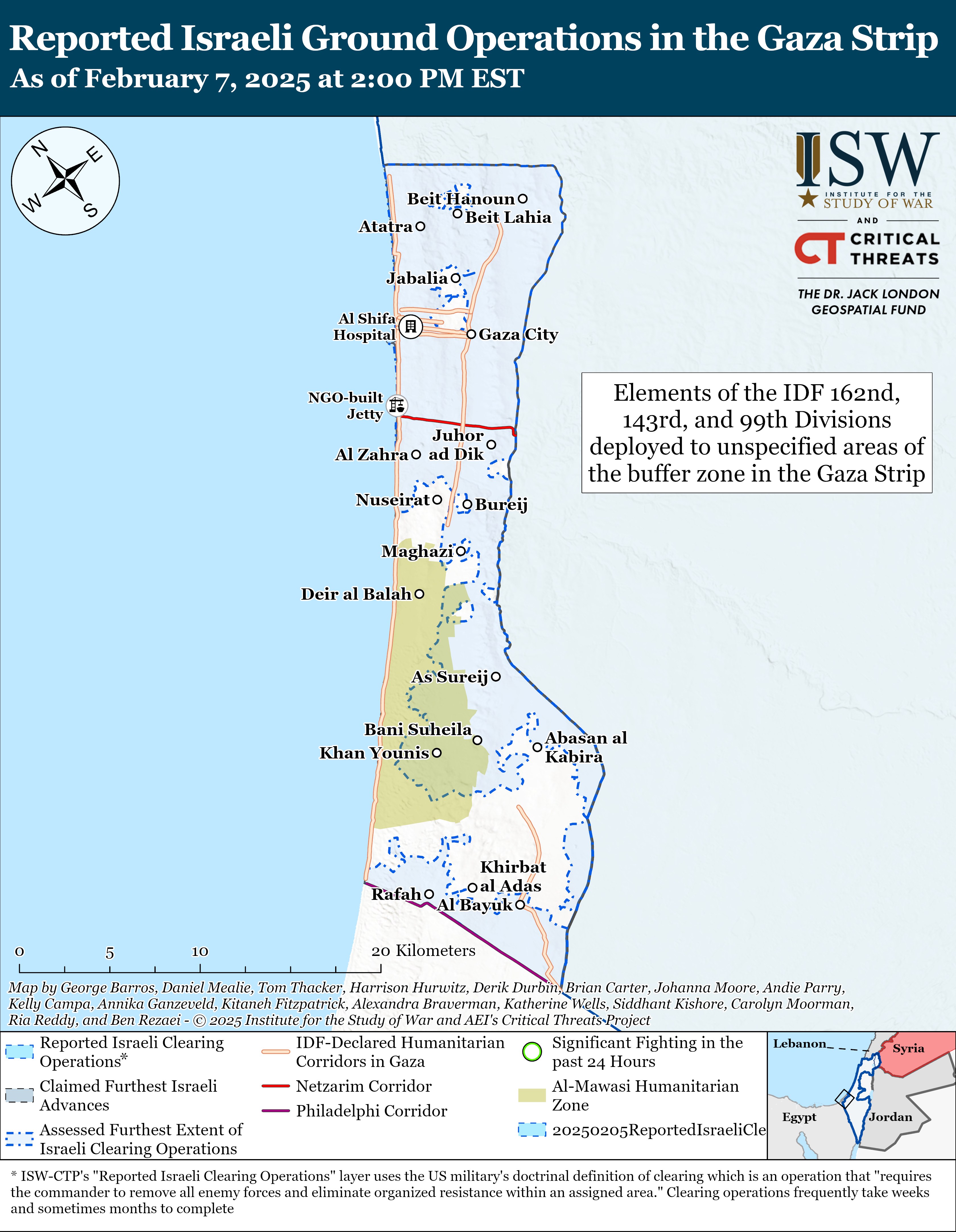 The Israel Defense Forces (IDF) deployed elements of the 162nd, 143rd, and 99th Divisions to unidentified areas in the Gaza Strip, presumably in the buffer zone, on February 7 to better defend Israelis in the Gaza Envelope.[61] The IDF 162nd Division withdrew from the northern Gaza Strip and deployed to the IDF-designated buffer zone along the Gaza Strip’s northeastern boundary on January 18.[62] The IDF reported that the three divisions moved into new locations to ”strengthen the layer of defense for [Israelis] in the western Negev,” which suggests that the IDF deployed these divisions in the buffer zone. The western Negev describes the area along the Gaza Strip-Israel border that includes the Israeli towns in the Gaza Envelope that Hamas attacked on October 7, 2023. A Palestinian journalist reported that the IDF 143rd Division withdrew from some areas of Rafah in the southern Gaza Strip on January 18.[63] The IDF 99th Division withdrew from the northern Gaza Strip on January 5.[64] Several Southern Command commanders held situational assessments with the soldiers prior to the release of the next set of hostages.[65] The next release will take place on February 8, according to the ceasefire agreement.
