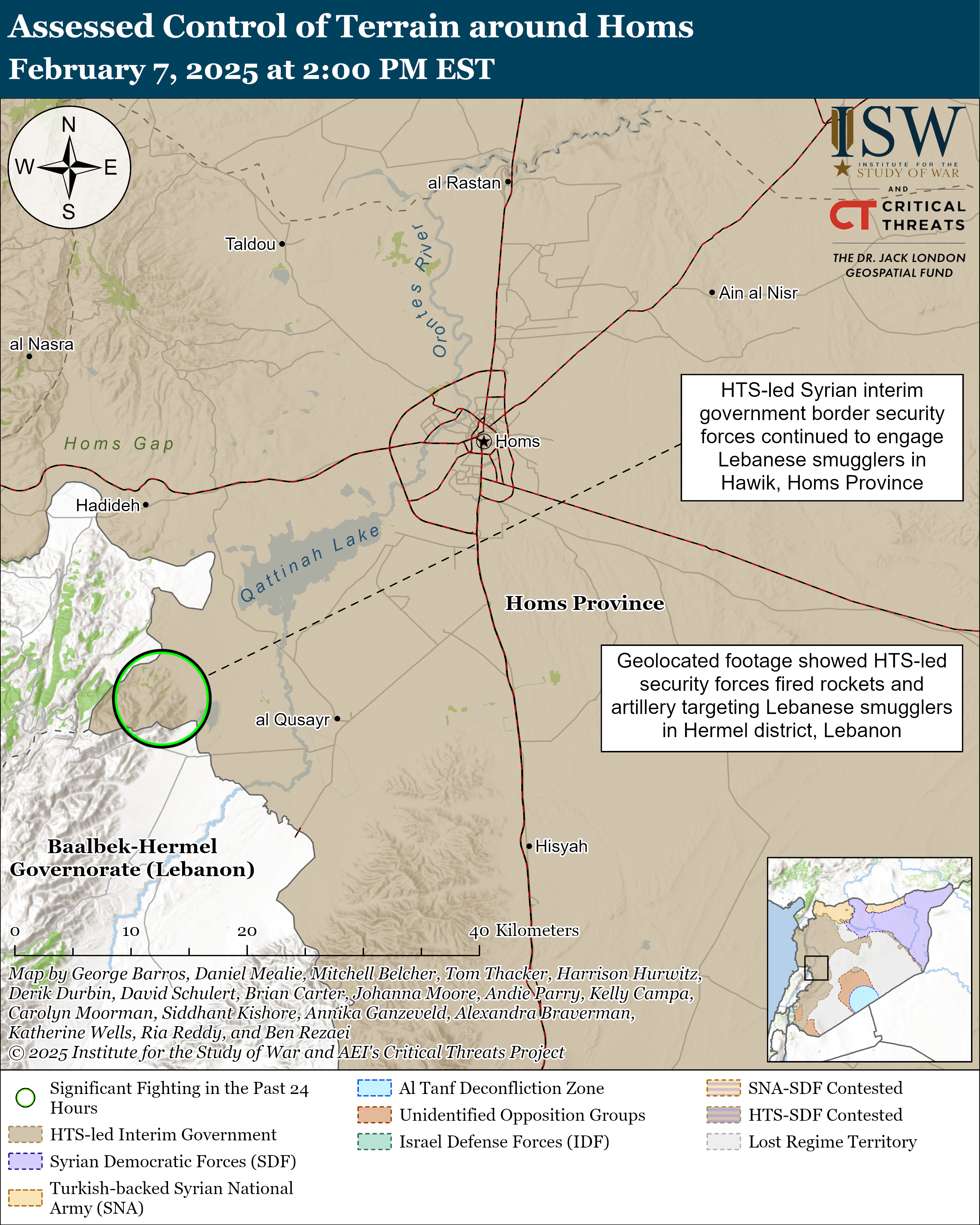 HTS-led Syrian interim government border security forces continued to engage Lebanese smugglers in Hawik, Homs Province, since CTP-ISW’s last data cutoff on February 6. Hezbollah-affiliated media reported on February 7 that interim government forces “launched an attack” on Hawik, a predominantly Lebanese village in Syria, on February 6.[39] There is no evidence of this ”attack” other than the Syrian interim government’s response to illegal smuggling along the border. A Syrian journalist reported on February 7 that interim government security forces reinforced their position south of Hawik, northeast of Qusayr.[40] The Syrian Department of Military Operations deployed to Hawik, northeast of Qusayr after smugglers kidnapped HTS fighters during a counter-smuggling operation on February 6.[41] Lebanese media reported that the Lebanese ”clans“ that were holding three HTS fighters captive reached an agreement and returned the HTS fighters to Syrian forces at the Jusiyah border crossing on February 6.[42]
