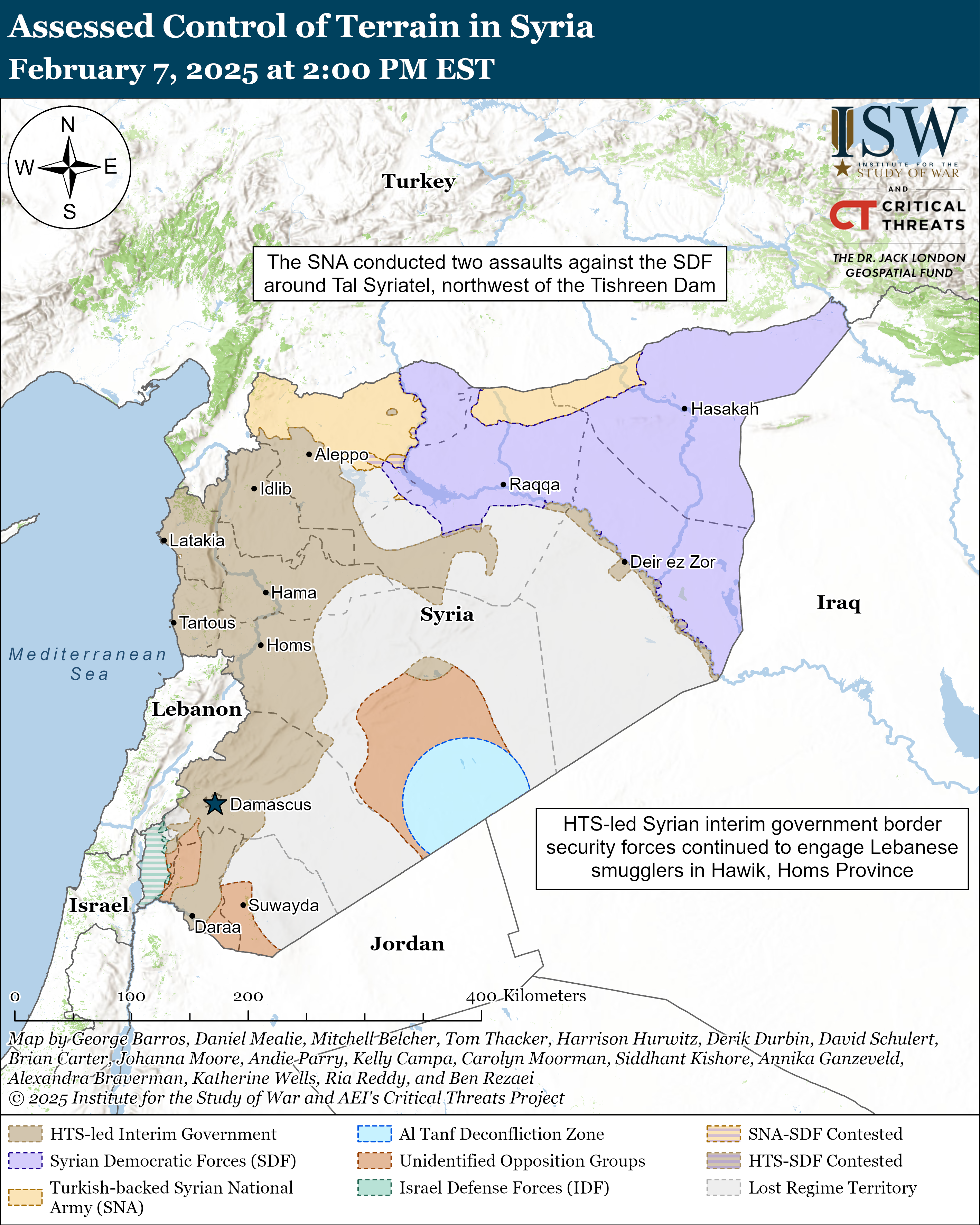 A Syrian journalist reported that Syrian interim government security forces later advanced on the border with Lebanon during operations against Hezbollah-affiliated smuggling groups.[43] Geolocated footage posted to X (Twitter) showed Syrian interim government forces firing an anti-tank guided missile (ATGM) from a rooftop in western Hawik on February 6.[44] Lebanese media reported that interim government rockets and artillery fire from Syria hit three locations in Lebanese territory on the Syria-Lebanon border.[45] A Syrian Arab media outlet posted footage on February 7 that reportedly showed HTS fighters in Jarmash, Lebanon.[46] CTP-ISW cannot confirm the presence of HTS fighters in Lebanon at the time of this writing. A Syrian journalist reported that four Lebanese nationals belonging to the Jaafar clan were killed in clashes with interim government forces on the Syria-Lebanon border.[47] The Jaafar clan is active in drug and weapons smuggling in the Bekaa region.[48] Lebanese President Joseph Aoun and Syrian interim President Ahmed al Shara agreed to coordinate to control the situation on the Lebanon-Syria border in a phone call on February 7.[49]