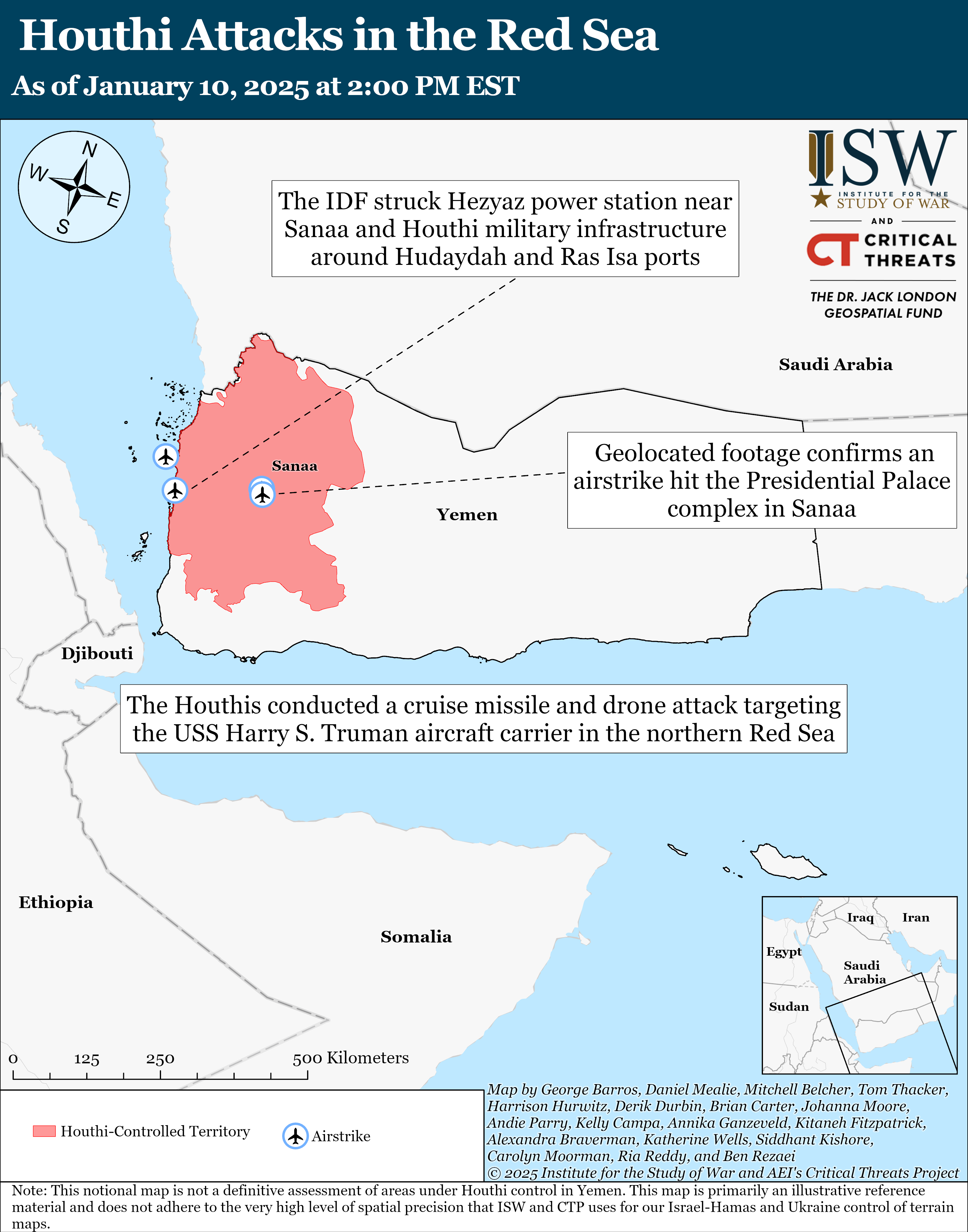 The IDF Air Force and the US-UK coalition conducted strikes targeting Houthi sites in Yemen on January 10 in response to repeated Houthi attacks on Israel and commercial ships in the Red Sea.[47] Targets included infrastructure at Hezyaz power station near Sanaa and military infrastructure around Hudaydah and Ras Isa ports.[48]