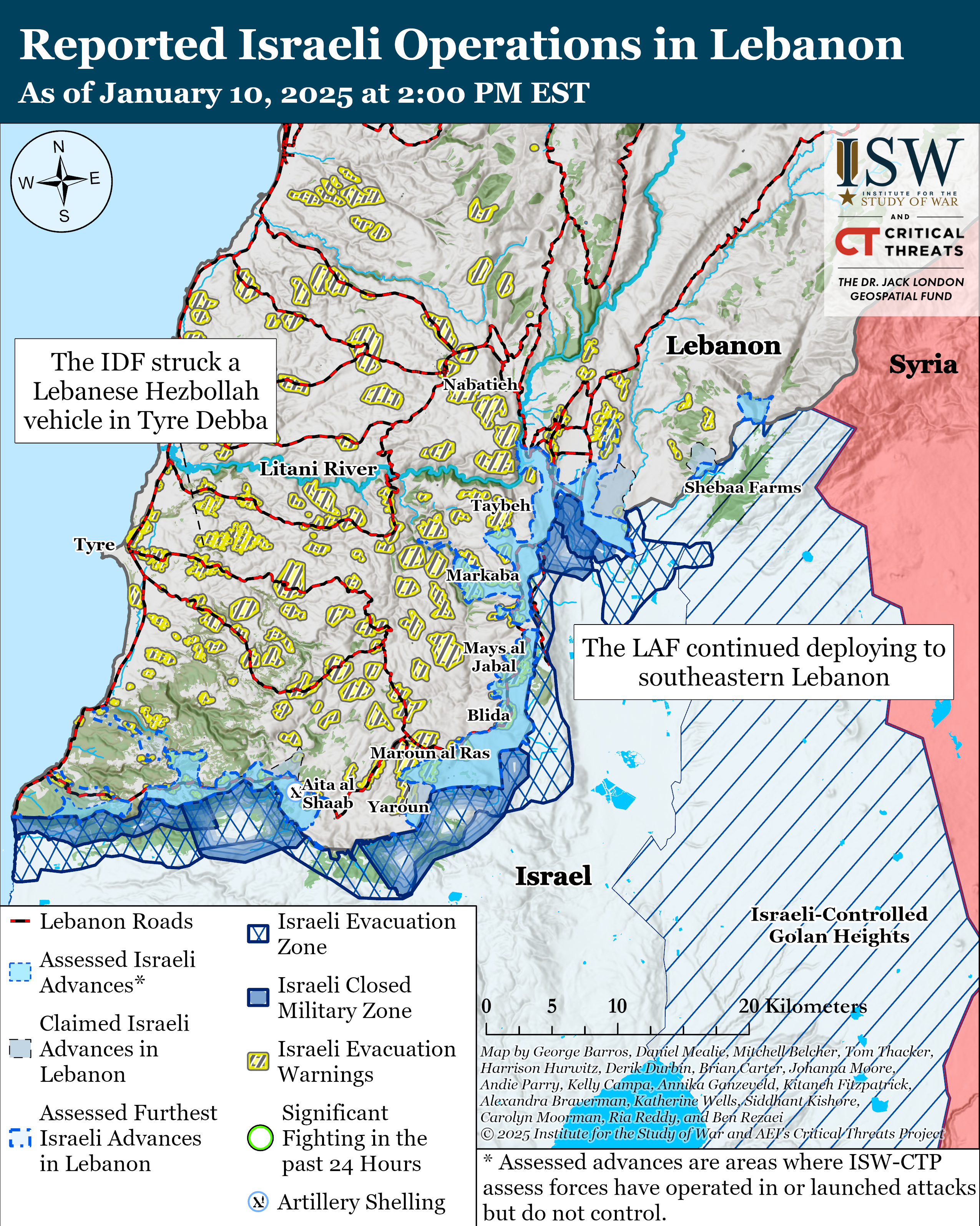 The LAF began to deploy to Aitaroun and Aita al Shaab, southern Lebanon, on January 10. Lebanese media reported that LAF armor entered Aitaroun.[66] The IDF last reportedly operated in Aitaroun on January 6.[67] Lebanese media also reported that the LAF approached the outskirts of Aita al Shaab after the IDF fired artillery around Aita al Shaab and detonated multiple explosives in the area earlier in the day.[68]