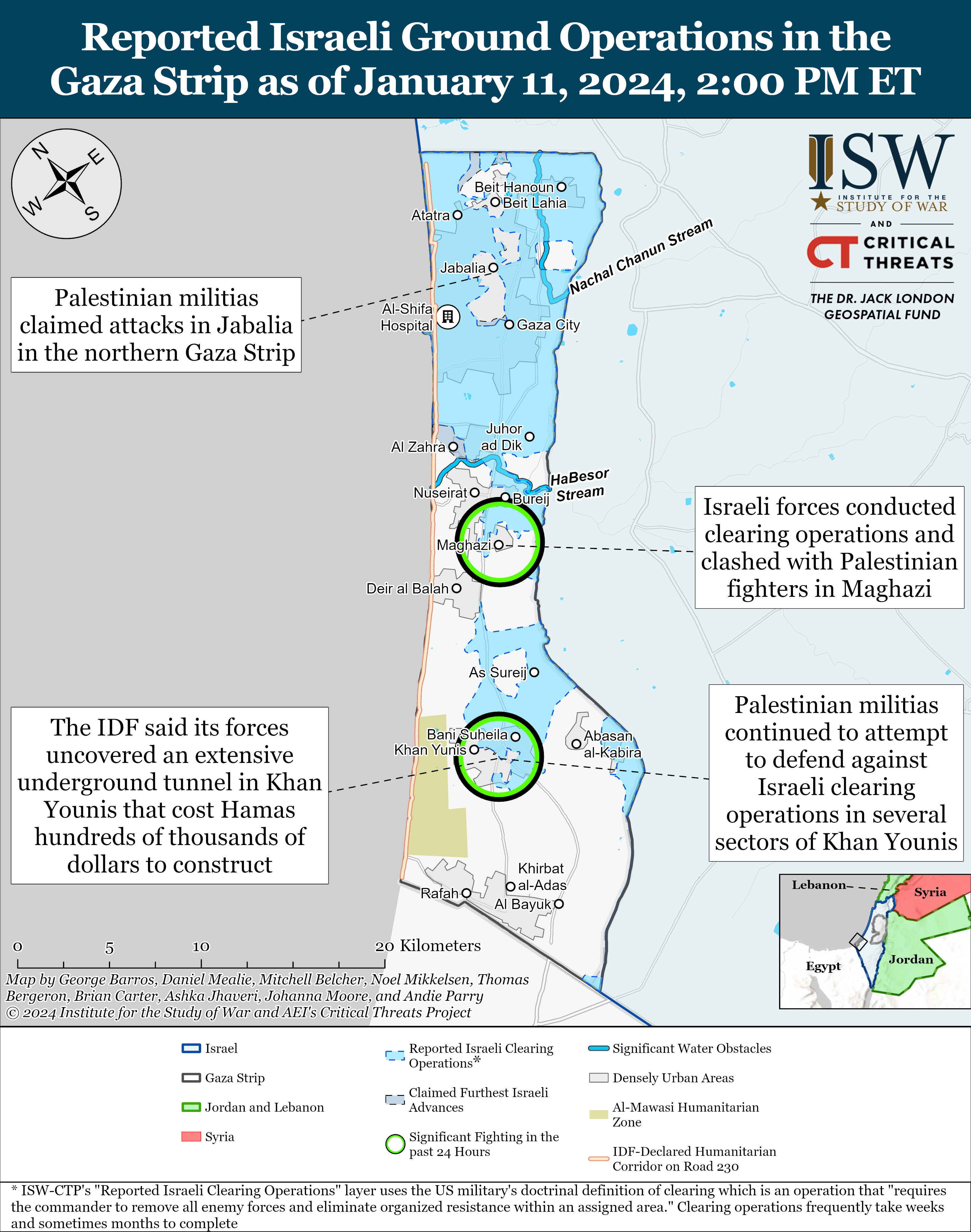 The IDF 98th Division continued clearing operations in Khan Younis on January 11. Israeli forces published footage of a tunnel system in Khan Younis that connects to an extensive underground network.[12] The IDF said that the tunnel is in the heart of a civilian area and cost Hamas hundreds of thousands of dollars to construct.[13] Israeli ground, engineering, and special operating forces (SOF) are leading the effort to locate and destroy tunnels in Khan Younis.[14] The IDF has located over 300 tunnel shafts and destroyed 100 of them.[15] Palestinian militias use the tunnels to conduct hit-and-run attacks targeting Israeli forces and to store weapons. The IDF Givati Brigade directed several airstrikes targeting Palestinian fighters in Khan Younis who were planting improvised explosive devices, observing Israeli forces, and exiting buildings where Israeli forces had found weapons.[16] The IDF 4th Brigade (assigned to the 98th Division) engaged Palestinian fighters who previously fired anti-tank rockets at IDF forces.[17]