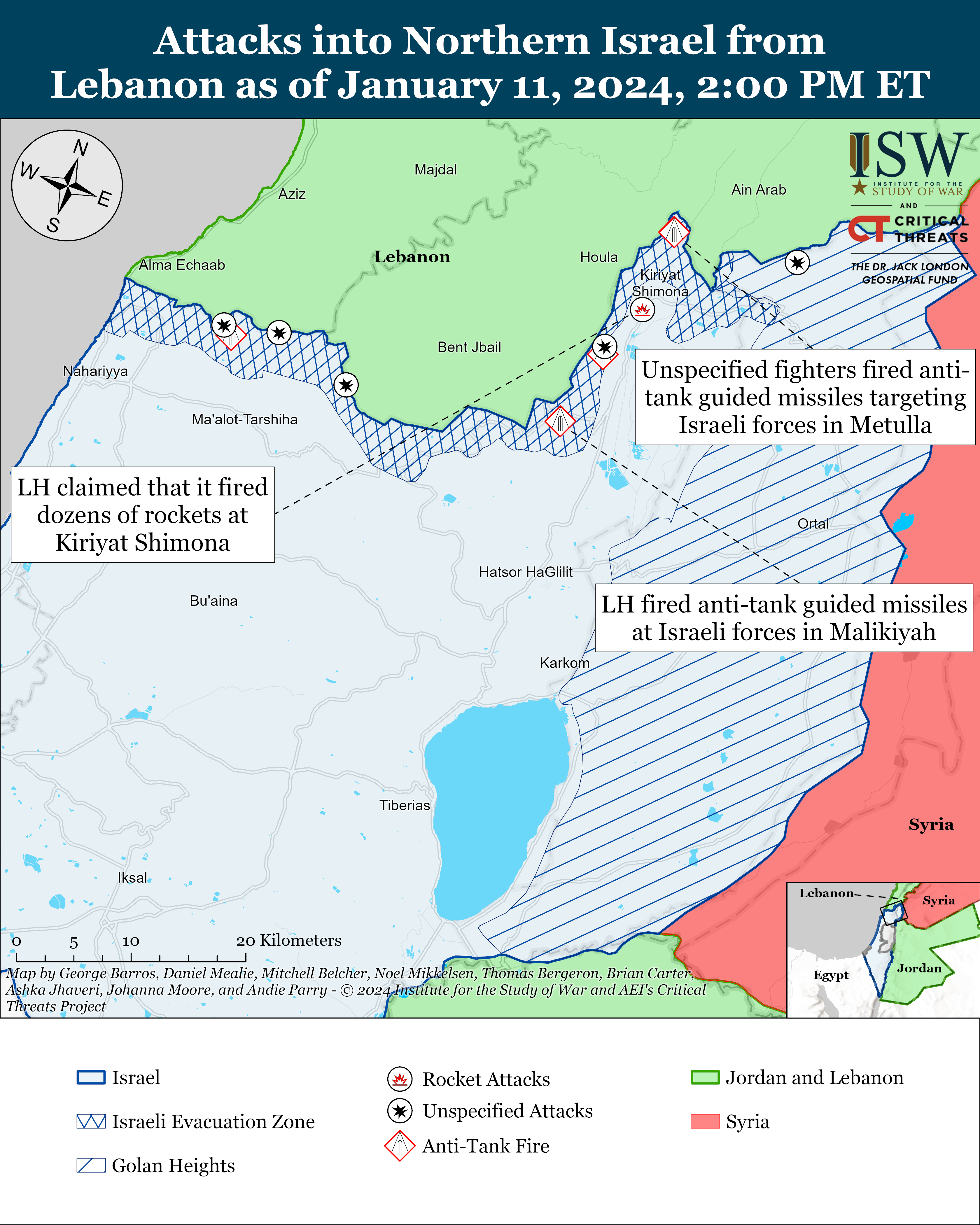 Iranian-backed militias, including Lebanese Hezbollah (LH), conducted 11 attacks from southern Lebanon into northern Israel on January 11.[38] This number of attacks is consistent with daily attack rates in northern Israel during the past week. The IDF said that unspecified fighters fired 10 rockets from Lebanon into Kiriyat Shmona and that Israeli forces shot down three of the rockets.[39] A video of the attacks shows rockets damaging buildings in the town.[40] LH claimed the attack, adding that it launched dozens of rockets on Kiriyat Shmona in retaliation for an Israeli strike that killed two paramedics in Lebanon.[41] Unspecified fighters conducted anti-tank guided missile attacks targeting Israeli forces in Metulla and Adamit.[42] The IDF conducted multiple strikes on LH military infrastructure in southern Lebanon on January 11.[43]