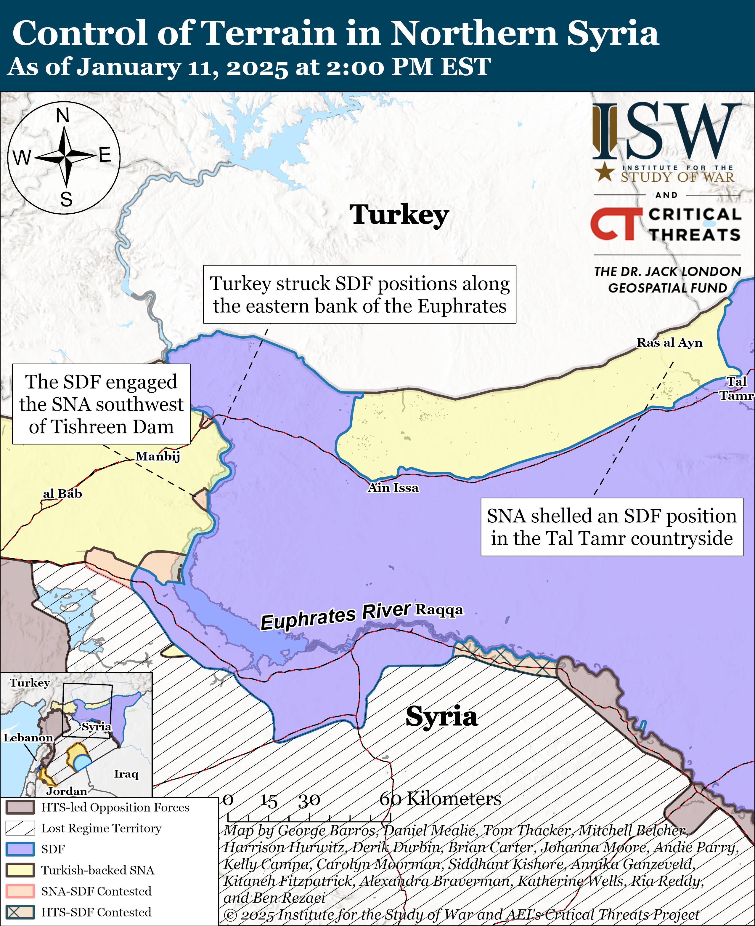 Turkey continued to support SNA operations to isolate SDF elements along the Euphrates River ahead of the possible offensive. Turkey conducted several airstrikes targeting SDF positions near Sarrin and along the eastern bank of the Euphrates River on January 11, according to local media.[19] These strikes are likely meant to undermine SDF defenses against the SNA along the Euphrates River and the SDF ability to defend against a potential SNA offensive from Peace Spring territory.