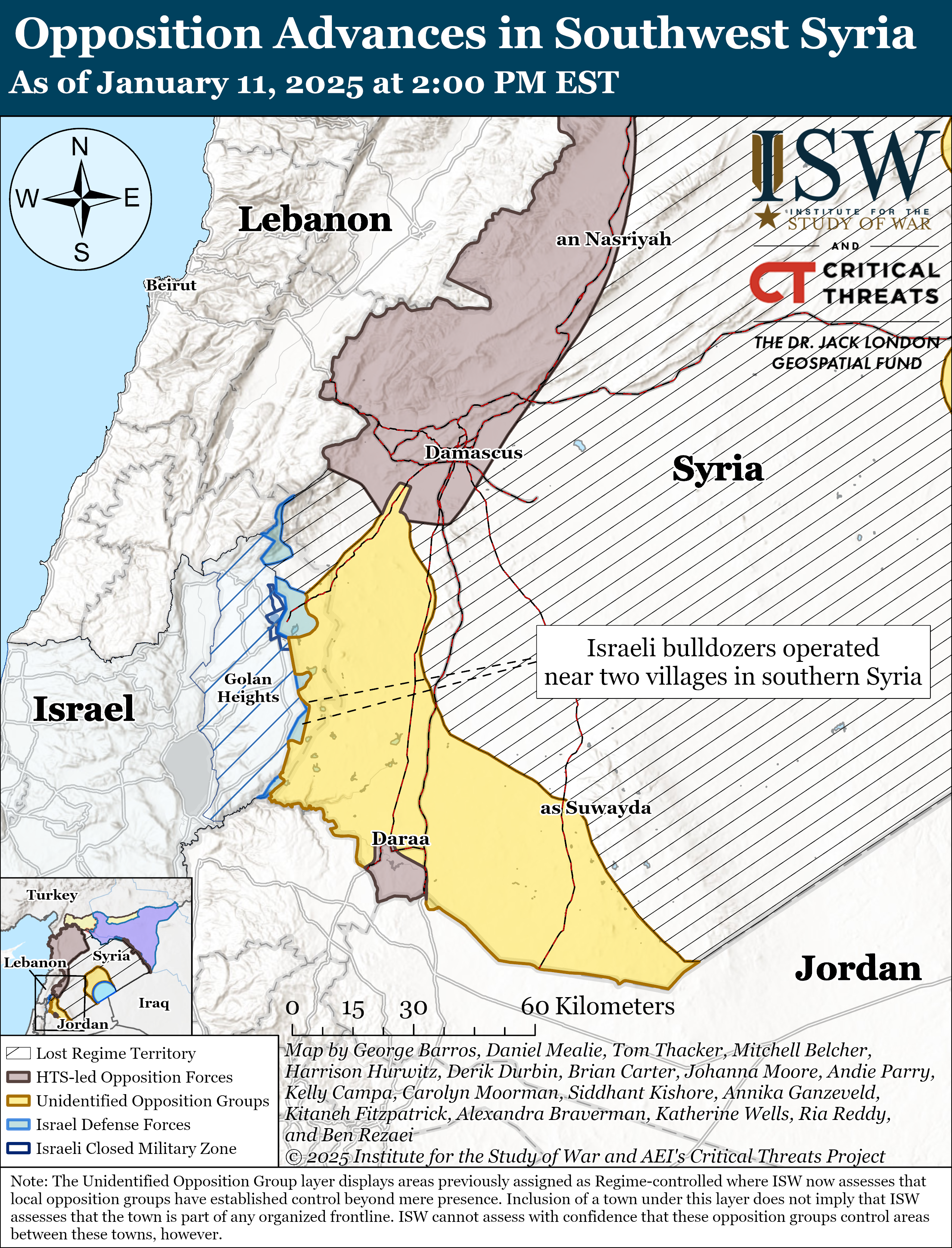Click here to see CTP and ISW’s interactive map of Israeli ground operations, and here to see CTP and ISW’s interactive map of the ongoing opposition offensive in Syria. These maps are updated daily alongside the static maps present in this report.