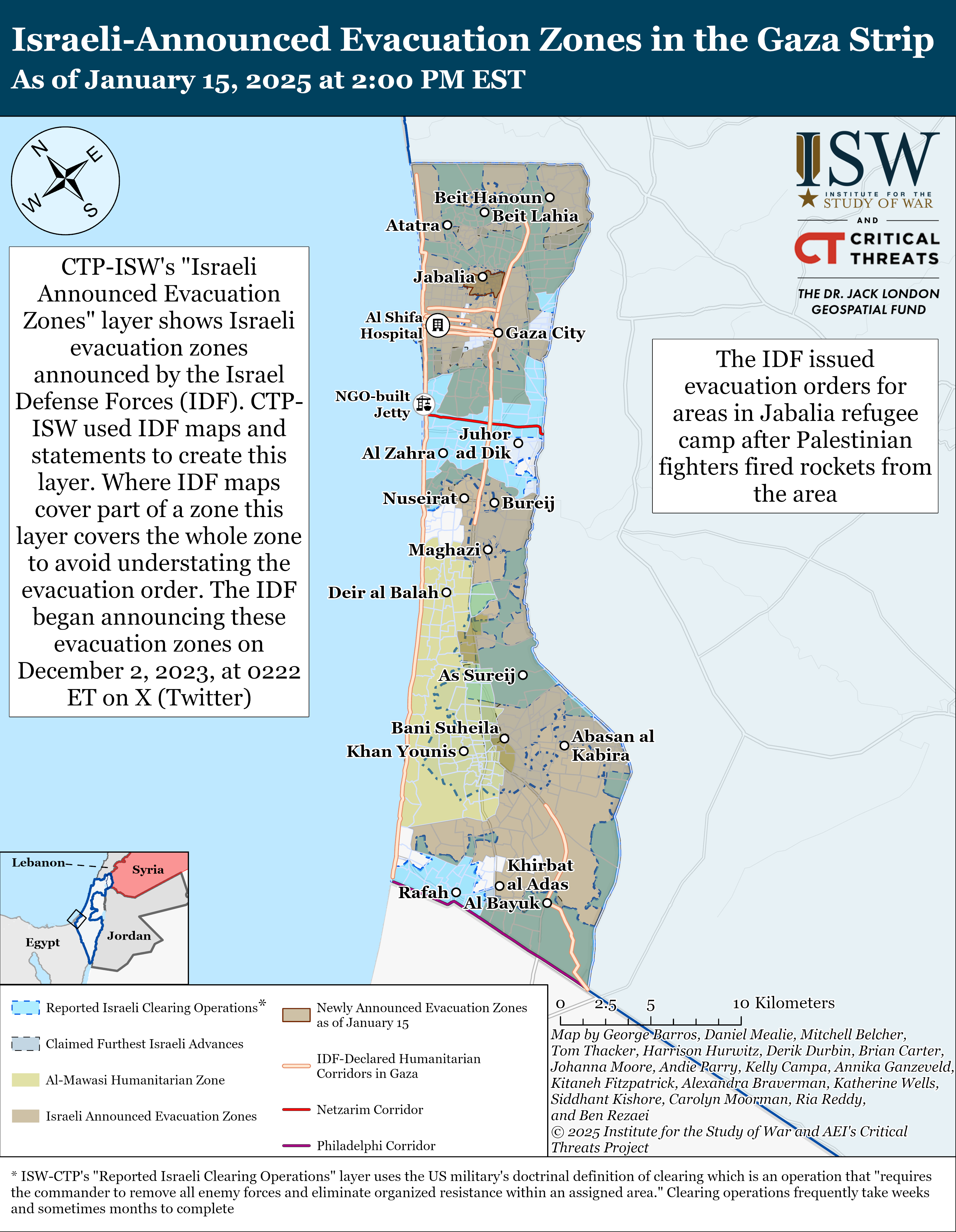 - Gaza Strip Ceasefire: Israel and Hamas approved a ceasefire-hostage agreement on January 15. Qatari Prime Minister Mohammed bin Abdulrahman al Thani announced that mediators from the United States, Qatar, and Egypt will monitor the ceasefire, which will take effect on January 19. Hamas appears to have agreed to allow the IDF to remain in the Philadelphi Corridor, an operationally and strategically significant IDF-held area in the southern Gaza Strip, during at least the first phase of the ceasefire.