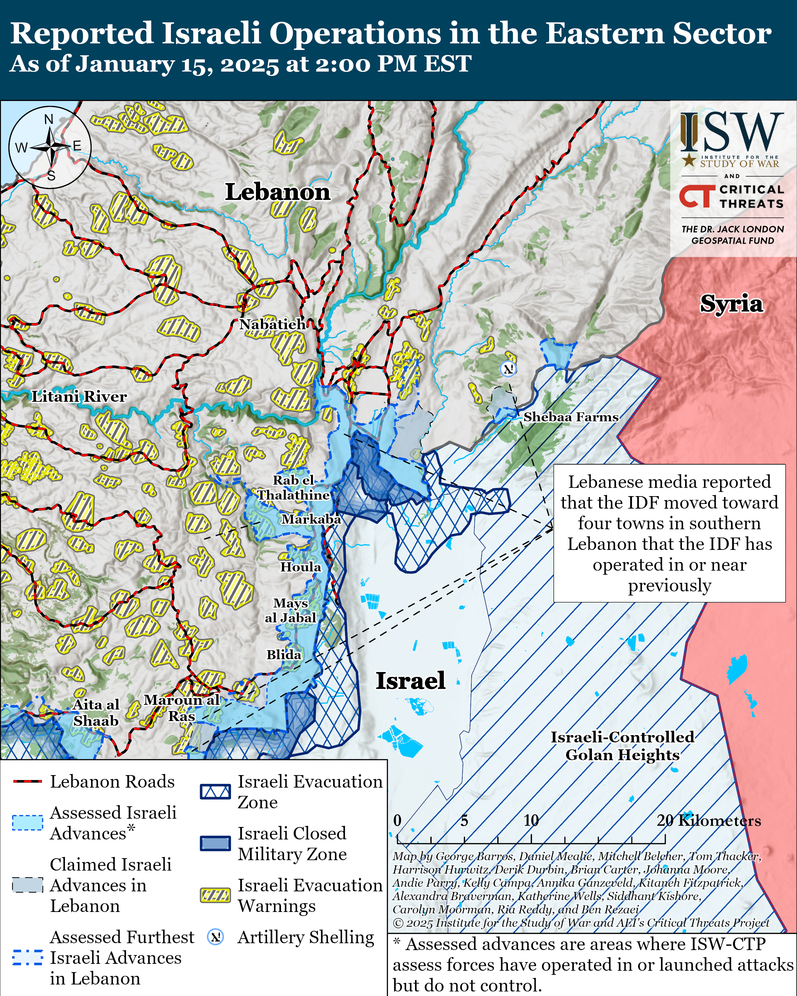 Hezbollah-affiliated and Lebanese media reported on January 15 that the IDF moved toward four towns in southern Lebanon that the IDF had previously operated in or near. Hezbollah-affiliated media reported that Israeli vehicles advanced toward Maroun al Ras, southwestern Lebanon.[87] Lebanese media separately reported that Israeli forces advanced toward Kfar Kila, Kfarchouba, and the Dora neighborhood of Yaroun in southeastern Lebanon.[88] Lebanese media reported that 25 Israeli vehicles advanced from Metula, Israel, toward Kfar Kila and stopped in Tal al Nahas.[89] Hezbollah-affiliated media separately reported on January 15 that IDF artillery shelled the Burj Matlin area, north of Kfarchouba.[90]