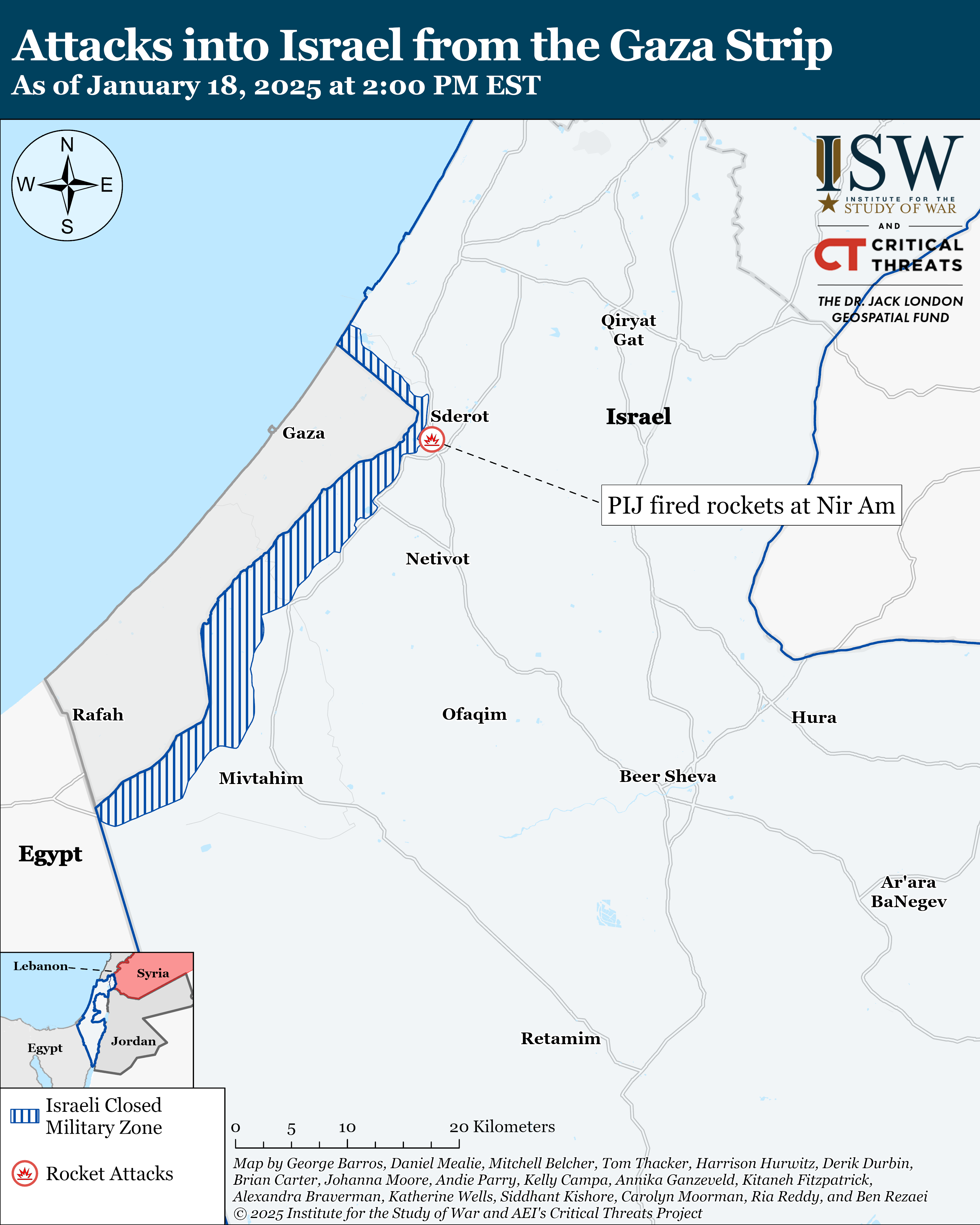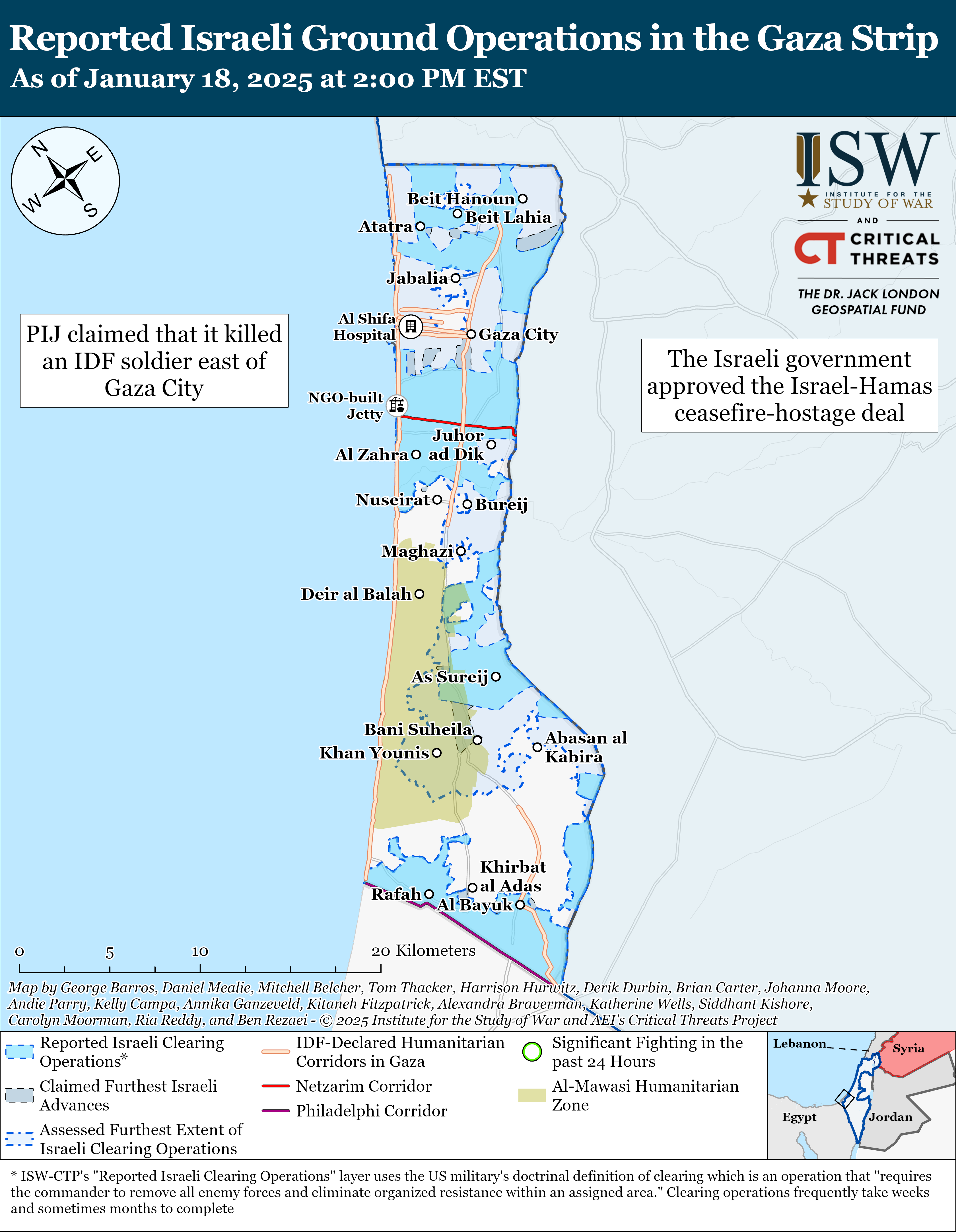 The Israeli government approved the Israel-Hamas ceasefire-hostage deal on January 18. The ceasefire will go into effect at 1:30AM ET on January 19 and the release of Israeli hostages will start at 9:30AM ET on January 19.[18] Unspecified security sources cited by Israeli Army Radio stated that Israel estimates that 25 out of the 33 hostages Hamas will release in the first phase of the deal are alive.[19] Hamas is expected to release three hostages on January 19 and release the other 30 hostages every subsequent Saturday until March 1.[20] An unspecified Israeli official said that Hamas has not provided the names of the three hostages to Israel for the January 19 exchange as stipulated under the agreement.[21] The official warned that Israel would not move forward with the prisoner-hostage exchange if Hamas fails to provide the list prior to the deadline. Israeli media said that Israel will release 1,904 Palestinian prisoners in the first phase of the ceasefire deal.[22] The IDF has begun to withdraw some forces from the Gaza Strip and redeploy others to the buffer zone ahead of the ceasefire implementation.[23] The BBC cited an unspecified senior Palestinian official who claimed that Hamas will be permitted to operate its police force in the Gaza Strip under the ceasefire agreement.[24] CTP-ISW cannot independently verify this claim.