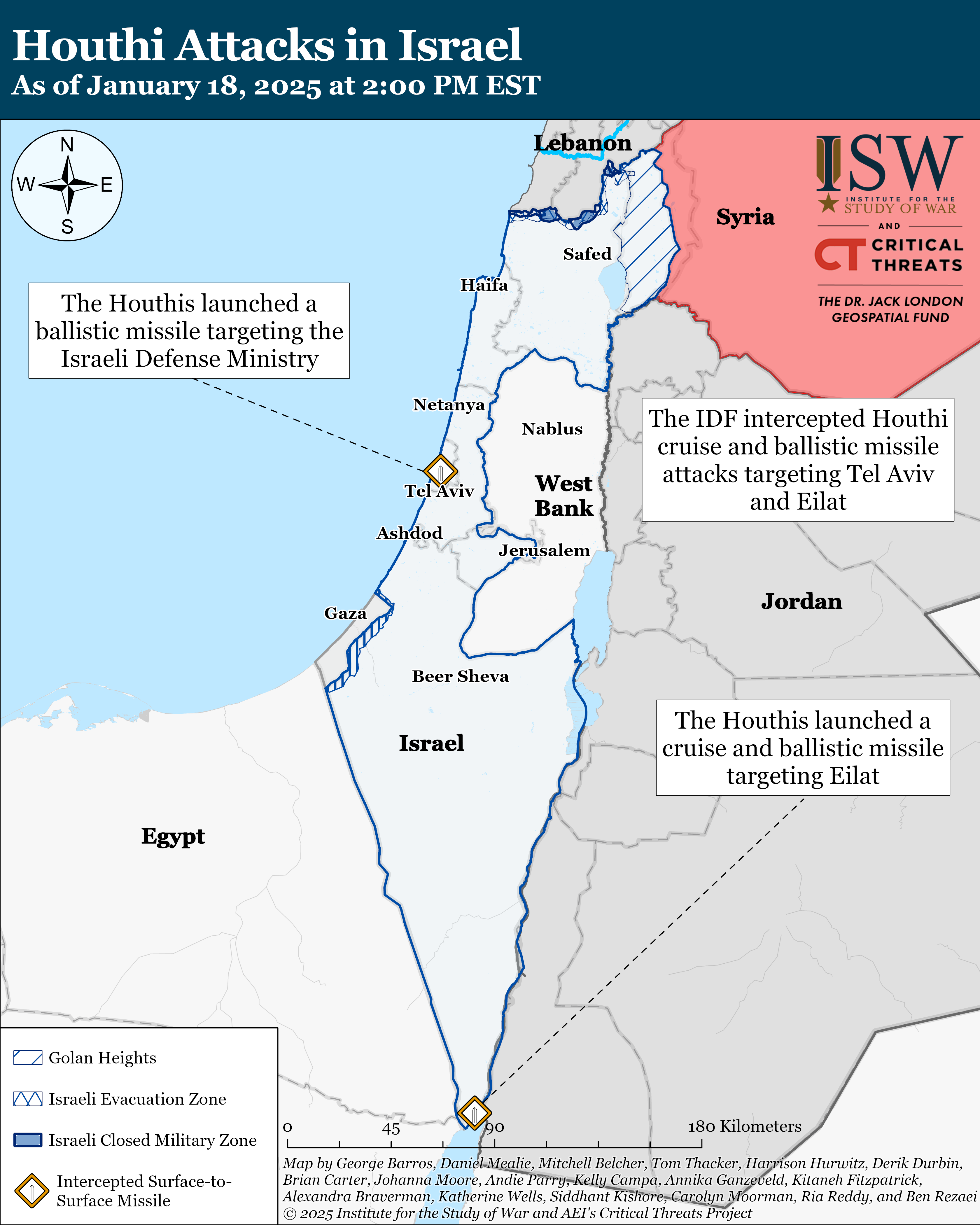 The Houthis conducted a ballistic missile attack that targeted the Israeli Defense Ministry in Tel Aviv and separately conducted a cruise and ballistic missile attack that targeted Eilat on January 18.[57] The IDF intercepted the missiles.[58] The Houthi Supreme Leader Abdulmalik al Houthi vowed on January 16 to halt attacks that target Israel if the Israel-Hamas ceasefire is upheld but stated that the Houthis would continue to attack Israel before the agreement is “implemented.”[59] The ceasefire will go into effect at 0130 ET on January 19.[60]