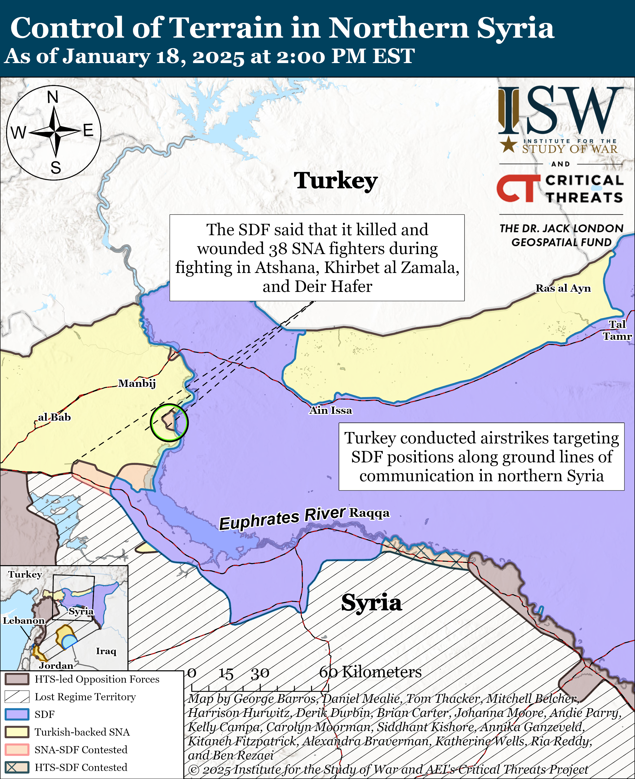 The SNA has continued to attempt to reduce the SDF bridgehead west of the Tishreen Dam since CTP-ISW’s last data cut-off on January 17. The SDF reported that its fighters killed 17 and wounded 21 SNA fighters and destroyed three SNA armored vehicles during fighting in Atshana, Khirbet al Zamala, and Deir Hafer on January 17.[49] Atshana and Khirbet Zamala are on the southern side of the SDF salient, but Deir Hafer is on Highway Route 4 and not part of the SDF bridgehead. Geolocated footage posted on January 17 showed the US-sanctioned Turkmen Sultan Suleiman Shah Brigade of the SNA shell SDF positions in Khirbet al Zamala.[50]