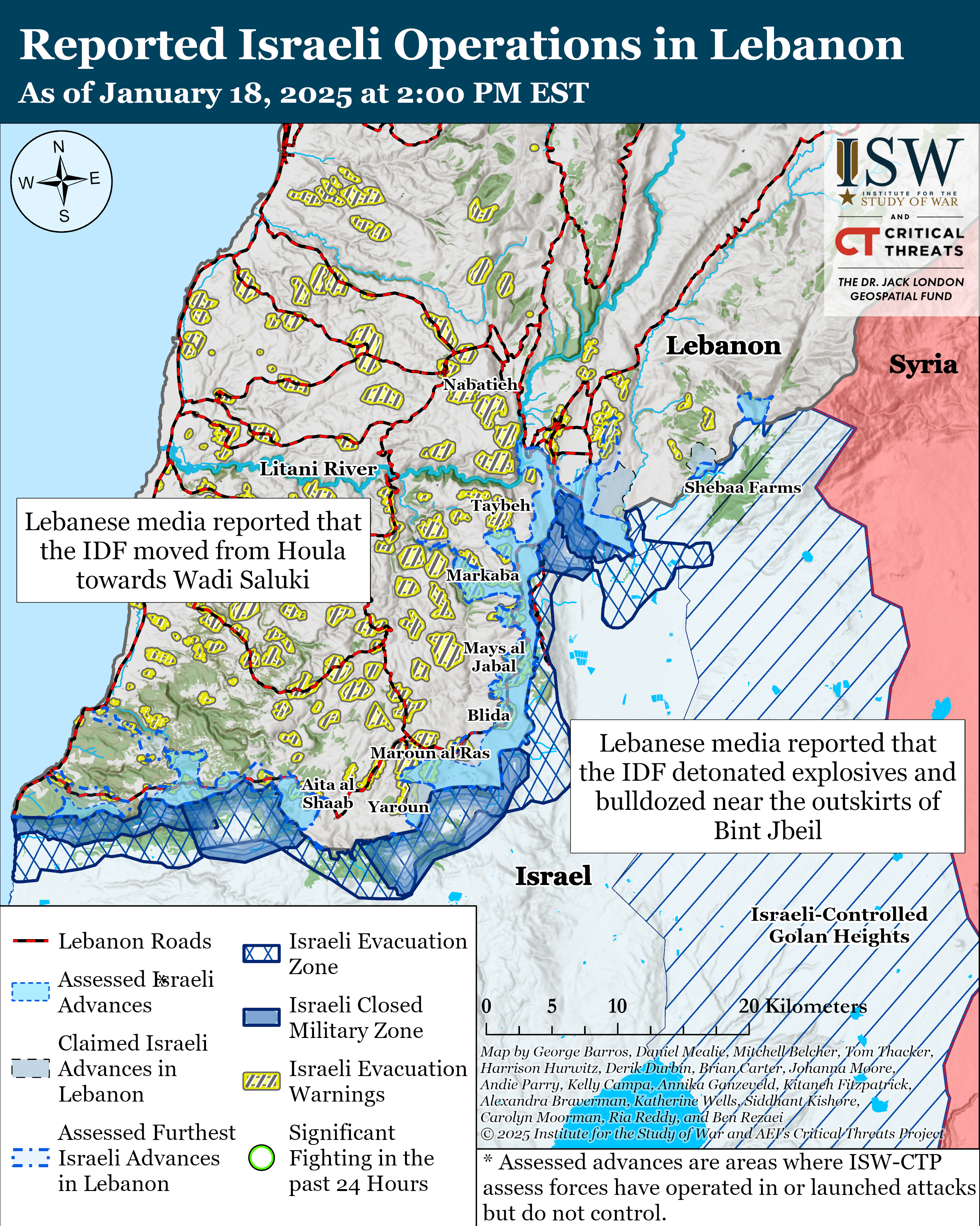 Lebanese media, including Hezbollah media, reported IDF activity on the outskirts of Bint Jbeil, southeastern Lebanon, on January 18.[67] Israeli armor reportedly advanced to the outskirts of Bint Jbeil from nearby Yaroun and bulldozed the area.[68] Israeli forces also reportedly detonated explosives near Maroun al Ras, which overlooks Bint Jbeil.[69]