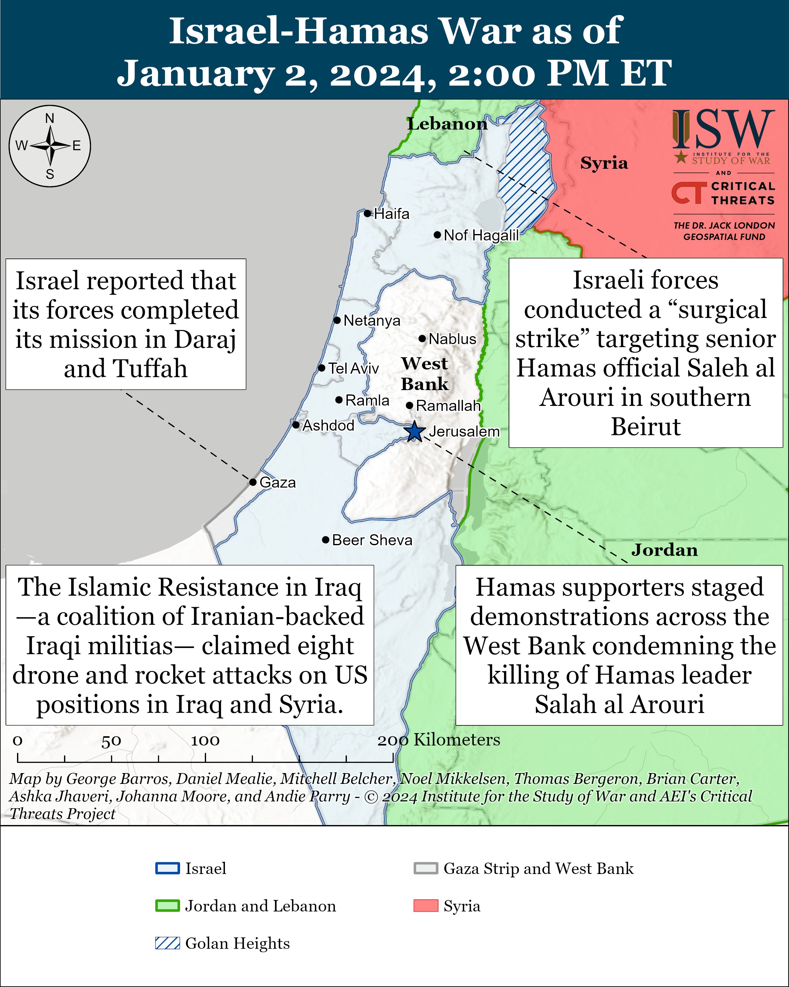 Israeli forces raided a Hamas and PIJ command and control center in Gaza City’s Shujaiya neighborhood on January 1.[24] Hamas and PIJ have coordinated their operations against Israeli forces in the Gaza Strip throughout the Israel-Hamas war.[25] The IDF also said on January 1 that it conducted an airstrike targeting Palestinian fighters who had fired mortars at Israeli forces.[26]