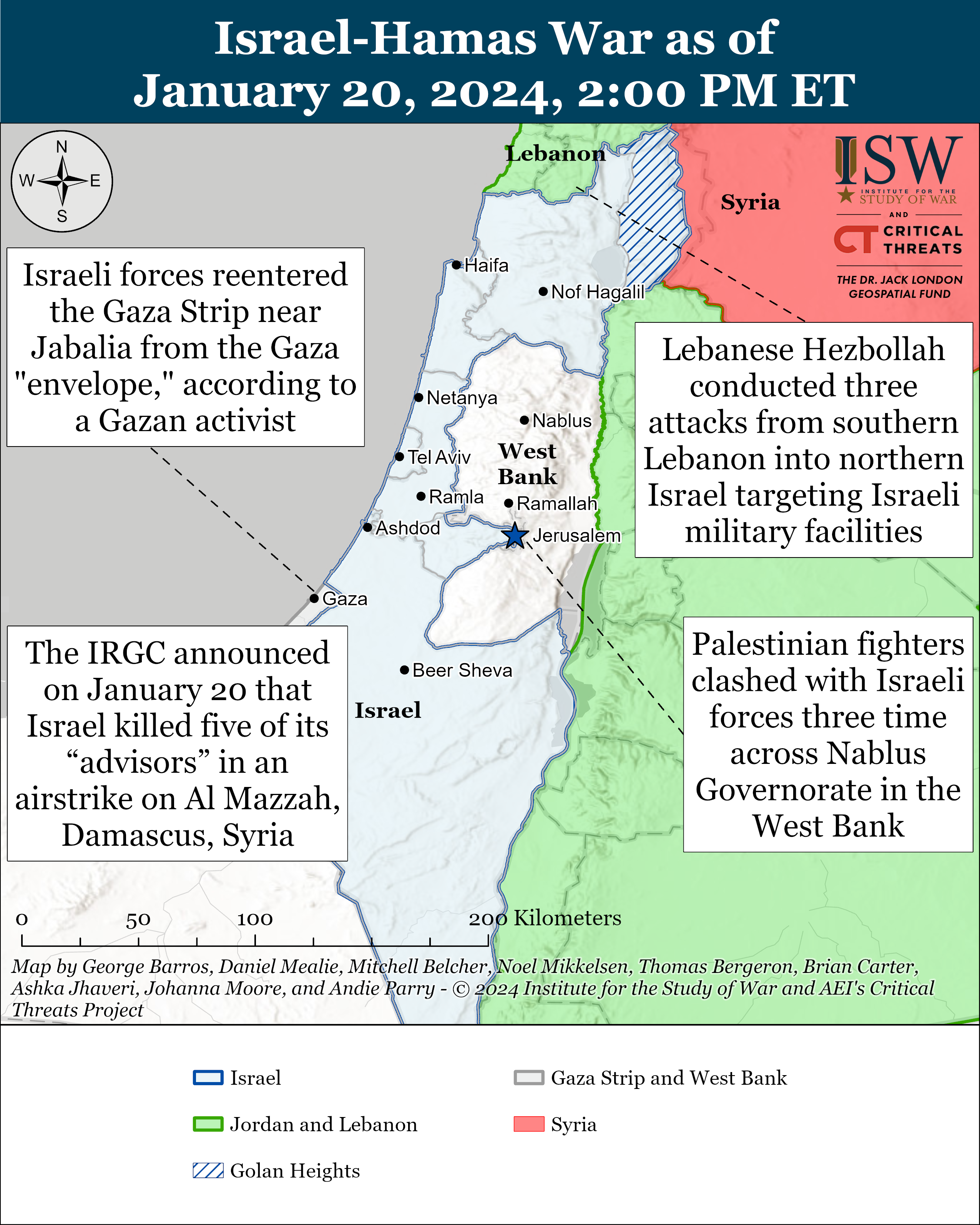- Israeli forces clashed with Palestinian fighters in eastern Jabalia on January 20. A local Gazan activist also reported that an Israeli armor convoy reentered eastern Jabalia from the Gaza “envelope.”