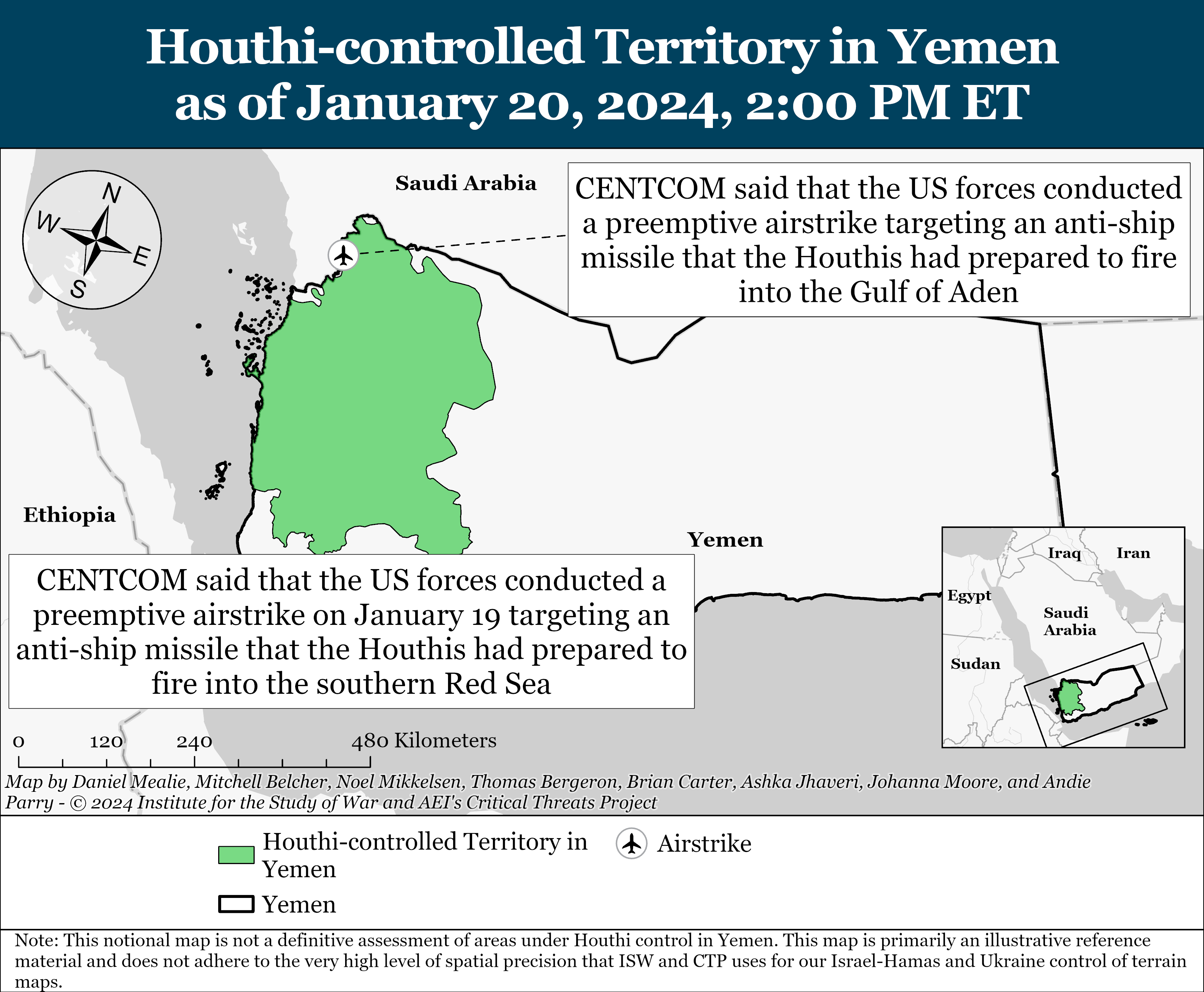 - US Central Command (CENTCOM) forces conducted two separate preemptive airstrikes on January 19 and 20 targeting anti-ship missiles that the Houthis had prepared to launch from Houthi-controlled territory in Yemen towards the Gulf of Aden and the Red Sea.