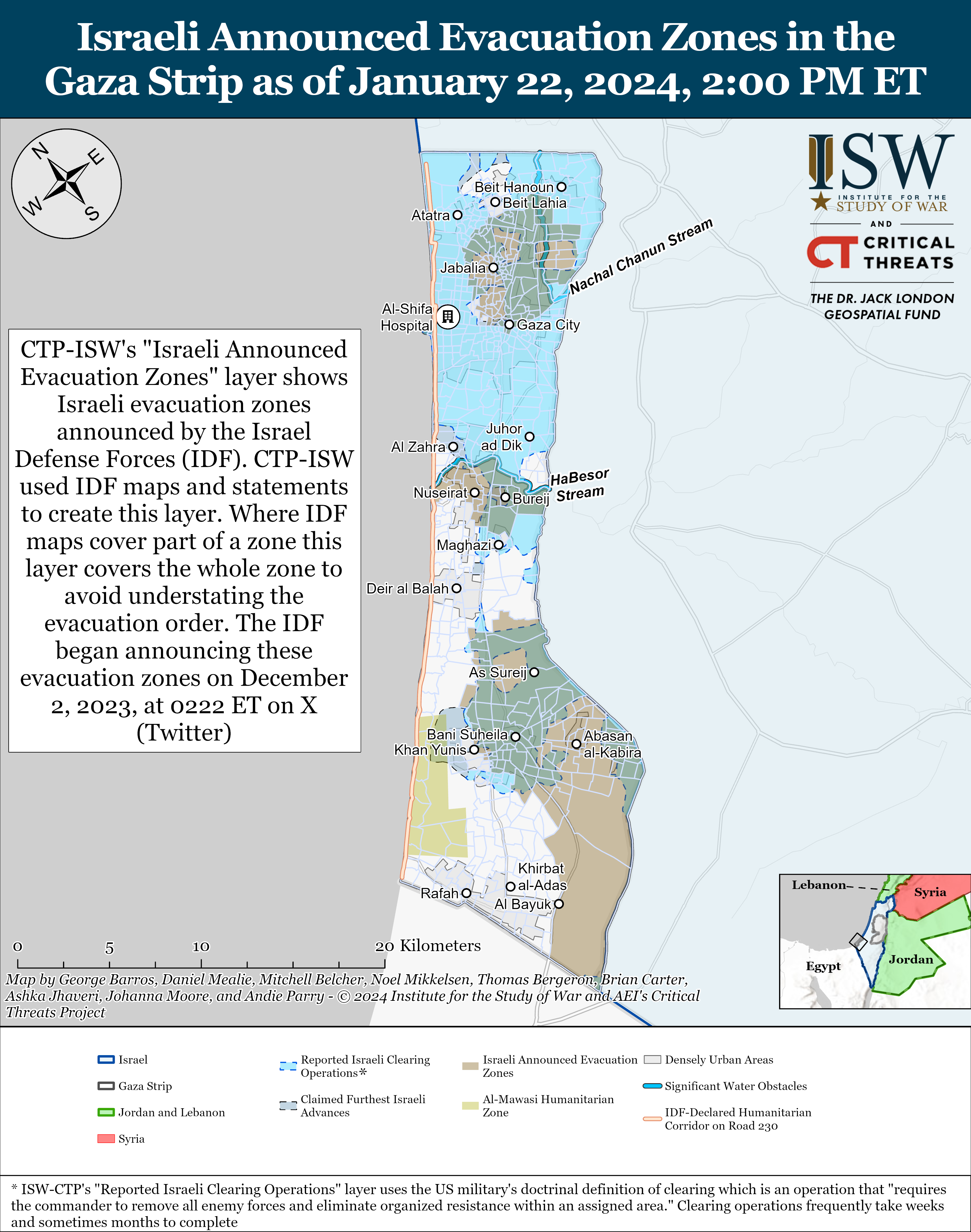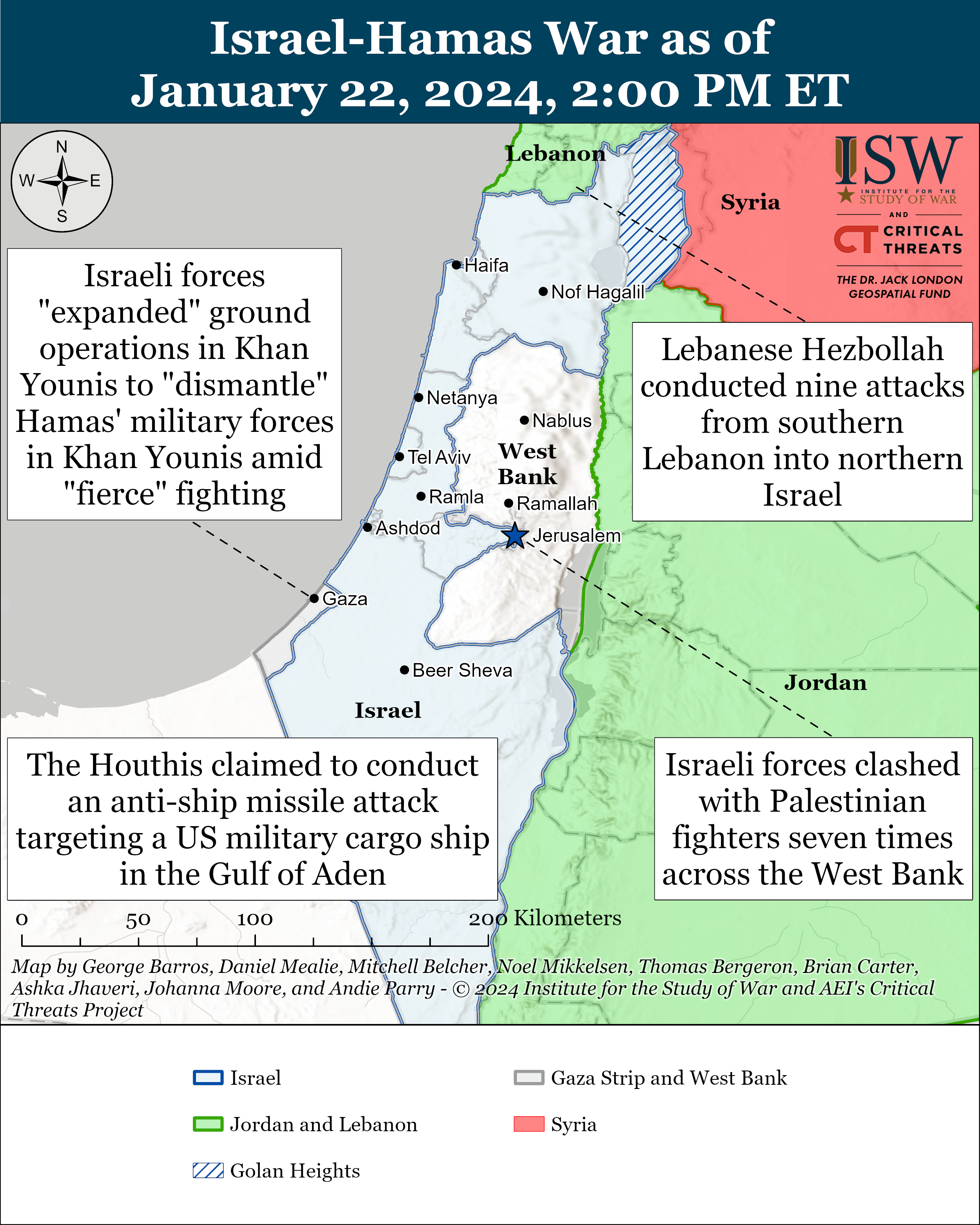 Israeli forces “expanded” ground operations in Khan Younis to “dismantle” Hamas’ military forces in Khan Younis.[1] The IDF 98th Division is executing the “expanded” ground operation in western Khan Younis. Palestinian militias are continuing to execute a deliberate defense against the Israeli ground operation in western Khan Younis. Israeli media described the operation as the “fiercest battle” between the IDF and Palestinian militias.[2] The operation aims to “dismantle” Hamas’ military forces in Khan Younis over “several days” by raiding Hamas outposts, “strongholds,” and capturing Hamas infrastructure.[3] An Israeli military correspondent reported that the 98th Division isolated the Khan Younis Refugee Camp after airstrikes overnight on January 21 and 22.[4] See the Gaza Strip Axis for more details on this development.
