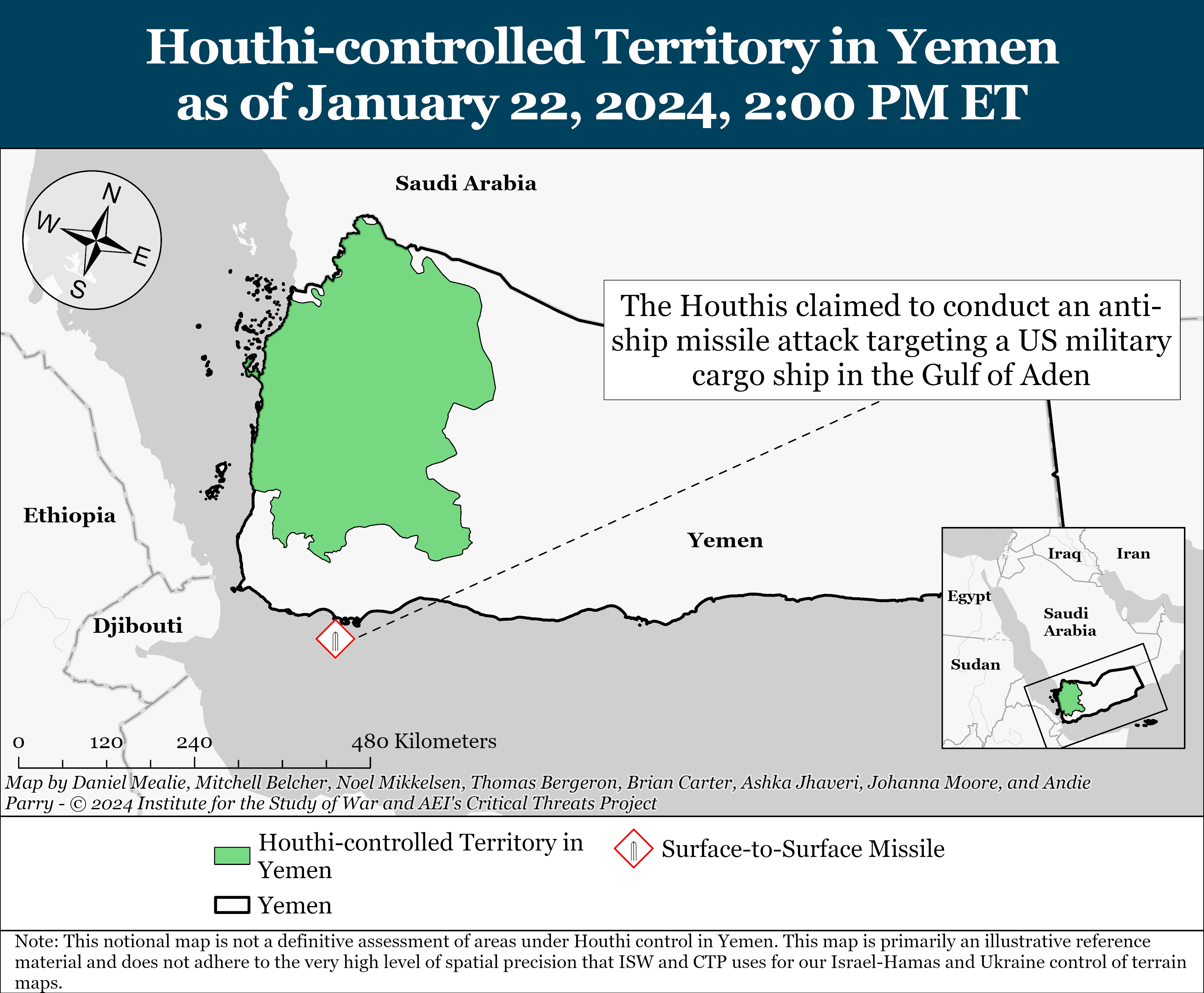 The Houthis claimed that they conducted a missile attack targeting an American military cargo ship in the Gulf of Aden on January 22. The group claimed to fire missiles at the US-flagged heavy load carrier Ocean Jazz but did not state whether they hit the vessel.[38] Shipping monitors did not report an incident in the Gulf of Aden on January 22 and unidentified US defense officials said the Ocean Jazz was not targeted by the Houthis.[39] The group’s military spokesperson threatened that the Houthis intend to respond to US and UK strikes on Houthi naval missiles and other military targets in Yemen.[40]