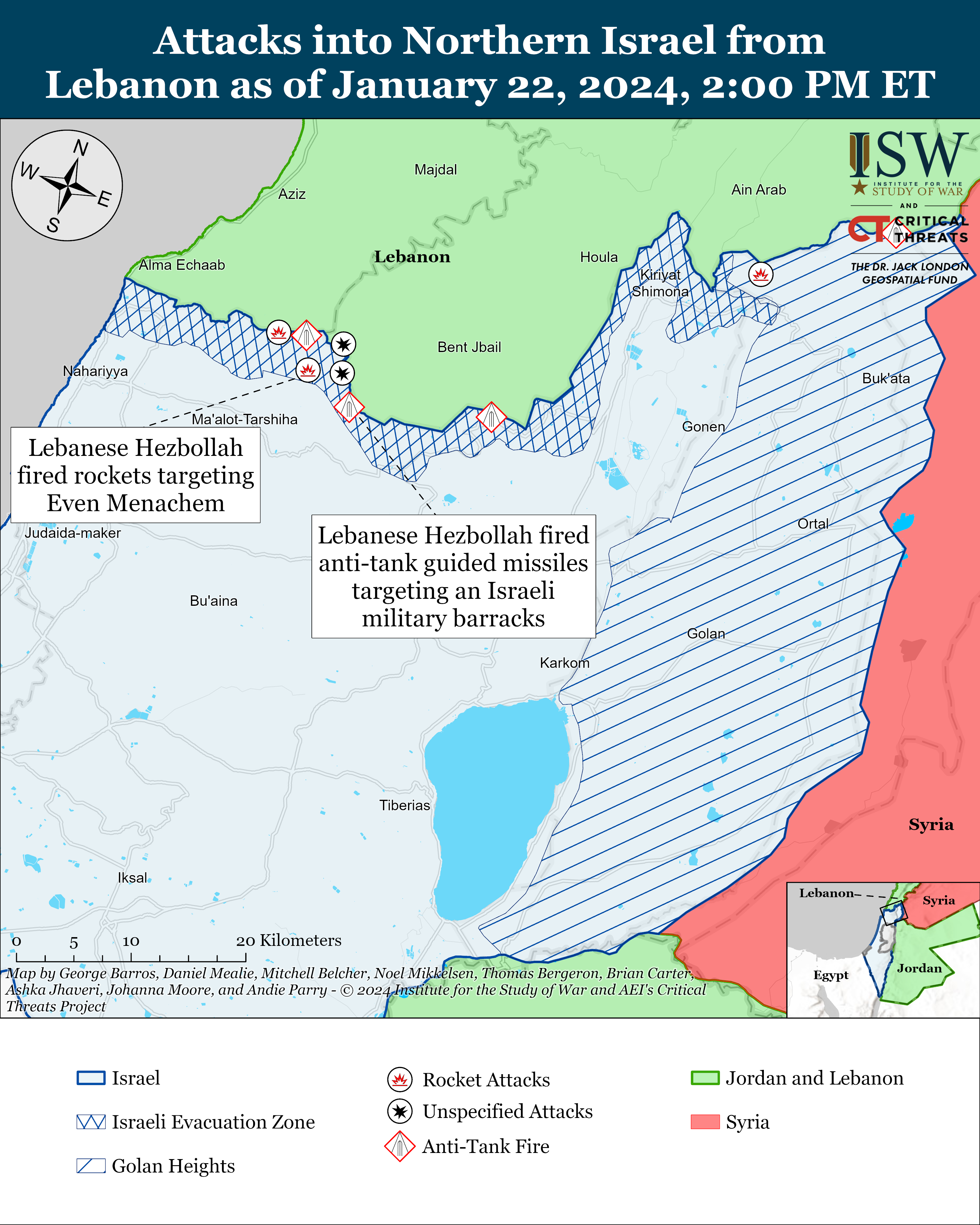 - Northern Israel and Southern Lebanon: Lebanese Hezbollah conducted nine attacks from southern Lebanon into northern Israel on January 22.