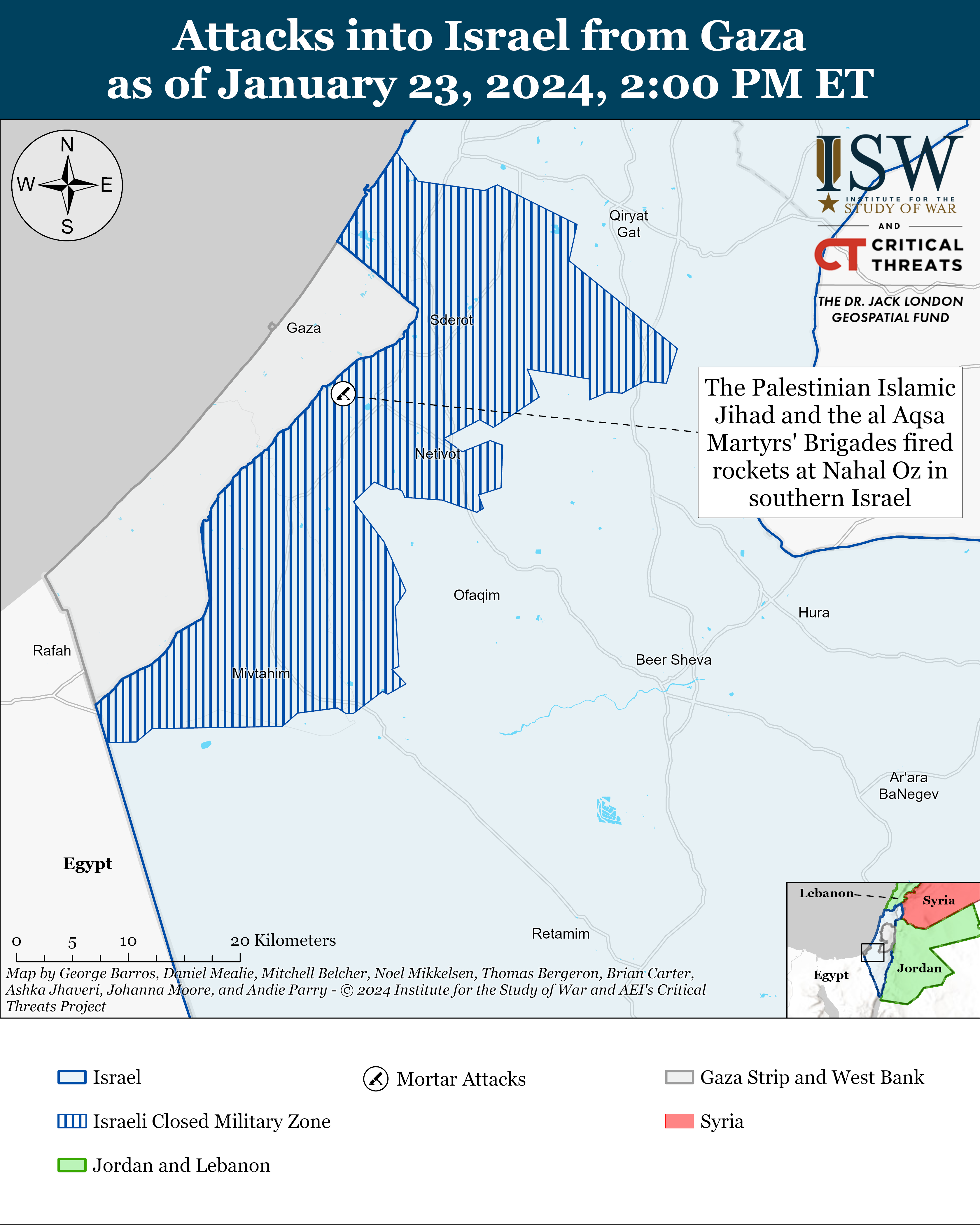 Palestinian militias are continuing to execute a deliberate defense against the Israeli ground operation in western Khan Younis. The military wings of Palestinian Islamic Jihad (PIJ), Fatah, and the Popular Front for the Liberation of Palestine (PFLP) claimed most of their attacks targeting Israeli forces in the Gaza Strip on January 23 in western Khan Younis.[14] PIJ claimed that it targeted an Israeli tank with an explosively formed penetrator (EFP).[15] Hamas fighters prevented an Israeli quick reaction force from removing an immobile tank after the fighters fired an RPG at it on January 21.[16]