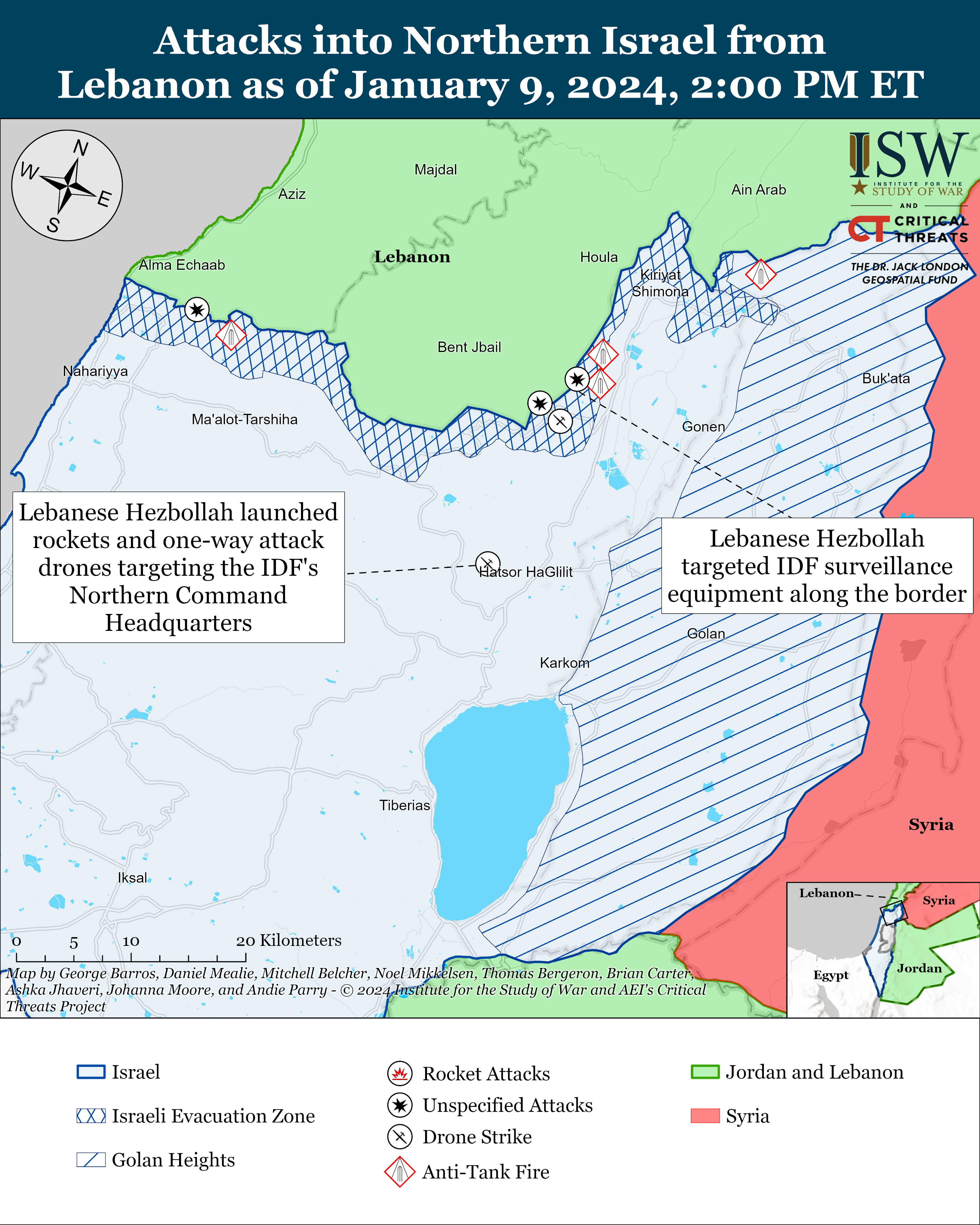 Iranian-backed militias, including LH, conducted nine other attacks from southern Lebanon into northern Israel on January 9.[56] LH targeted Israeli forces and military infrastructure and surveillance equipment with anti-tank guided munitions and other unspecified weapons. The IDF conducted airstrikes targeting LH headquarters and other unspecified military infrastructure in Yaroun and Kafr Kila in southern Lebanon.[57]
