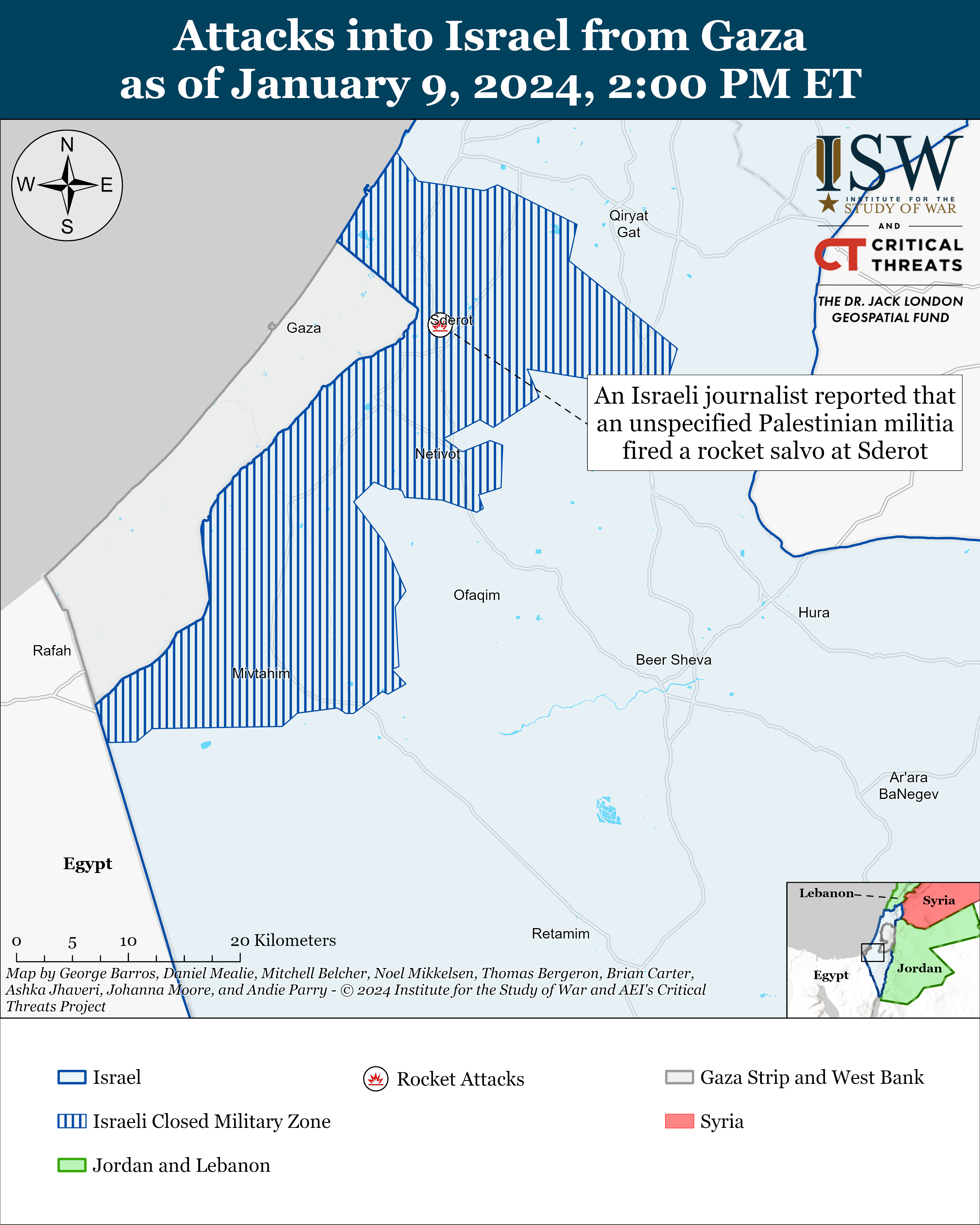 Palestinian militias conducted two indirect fire attacks into Israel from the Gaza Strip on January 9. The National Resistance Brigades fired rockets barrages at unspecified locations in southern Israel.[44] Israeli media separately reported a rocket attack on Sderot.[45]