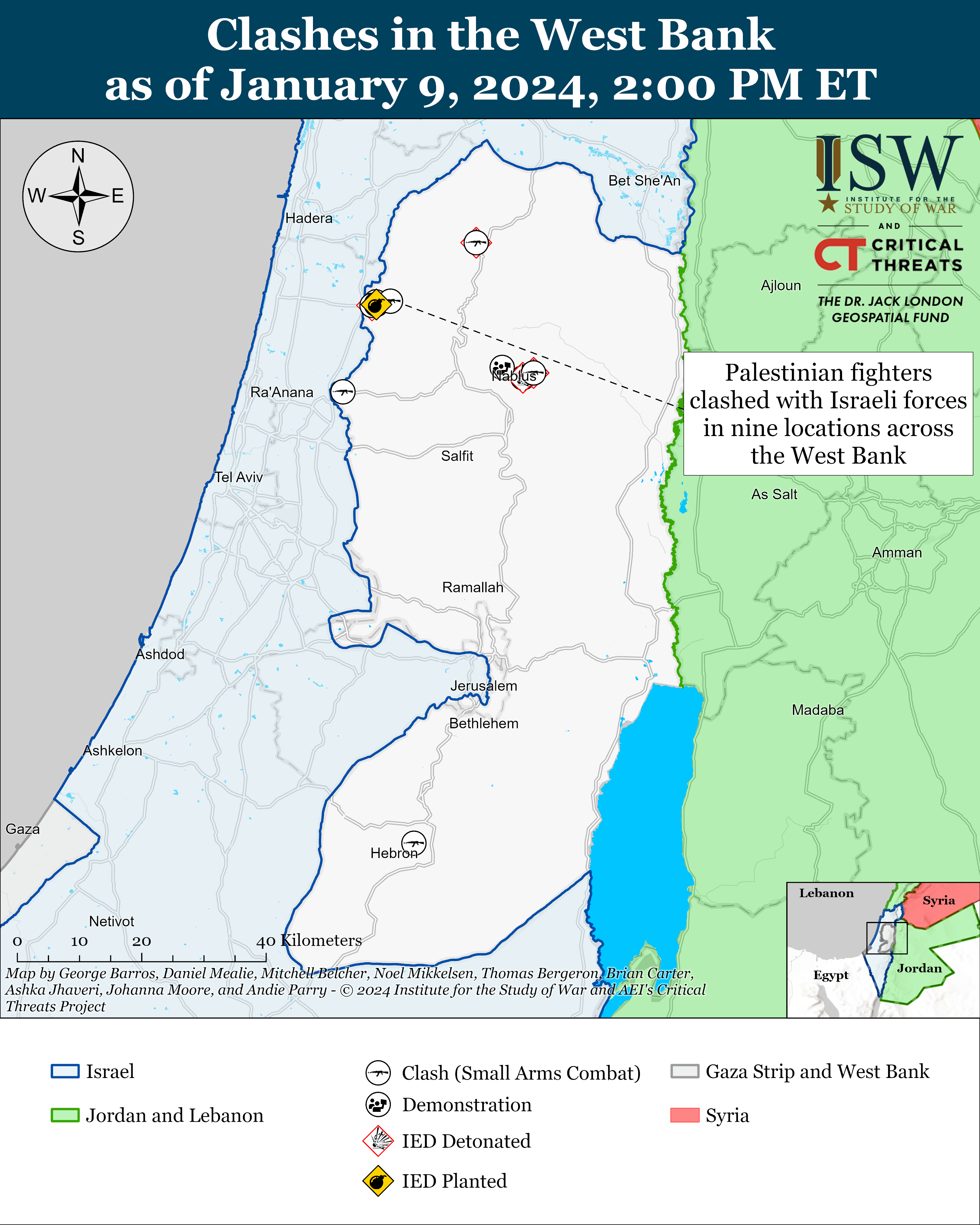 Israeli forces clashed with Palestinian fighters in nine locations across the West Bank.[46] The IDF conducted raids in Tulkarm overnight on January 9.[47] The al Aqsa Martyrs’ Brigades claimed that its fighters ambushed Israeli forces in Tulkarm refugee camp, killing and wounding an unspecified number of Israeli soldiers.[48] The Tulkarm Battalion and Rapid Response unit of the al Aqsa Martyrs’ Brigades detonated IEDs targeting Israeli forces in Tulkarm and Tulkarm refugee camp during the raids.[49] The al Quds Brigades similarly said that its fighters attacked Israeli forces in Tulkarm refugee camp. The brigades also claimed that it damaged at least one military vehicle during the fighting.[50] The IDF reported that it killed several Palestinian fighters who attacked Israeli troops in Tulkarm on January 9.[51] Several hundred Palestinian men demonstrated during a funeral procession for the fighters. The Palestinian Authority identified the fighters as members of the al Quds Brigades.[52]