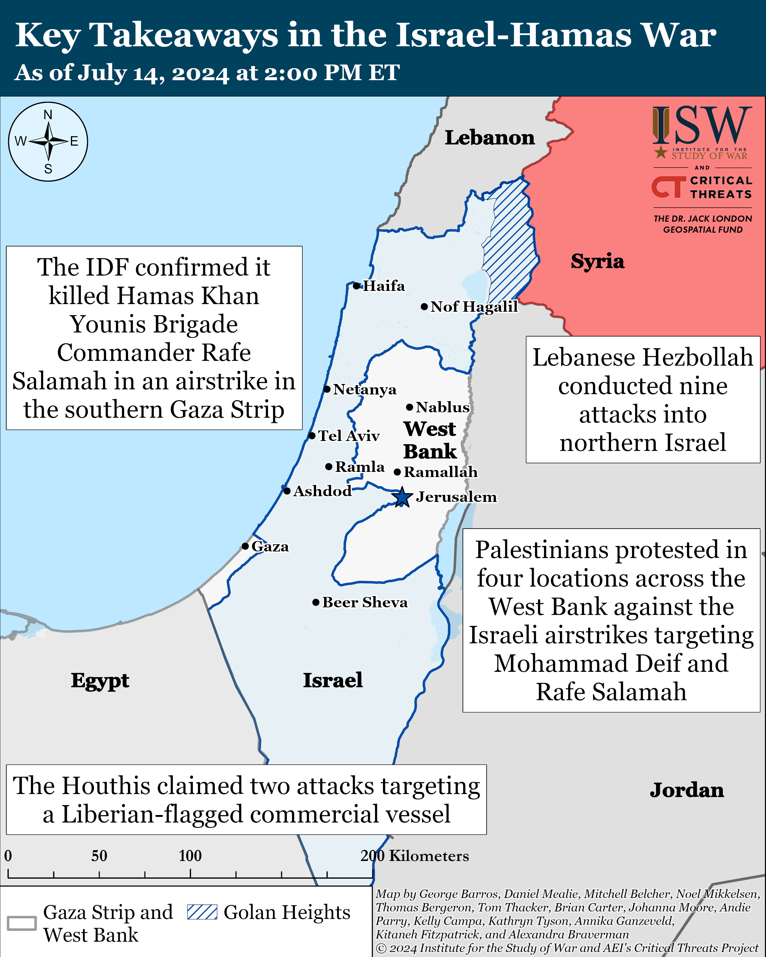 Palestinians demonstrated in at least four locations across the West Bank to protest Israeli airstrikes targeting Mohammad Deif and Rafe Salamah on July 13.[29] Palestinian media reported that Palestinians went on strike in various locations across the West Bank to condemn the July 13 strikes targeting senior Hamas commanders on July 14.[30]