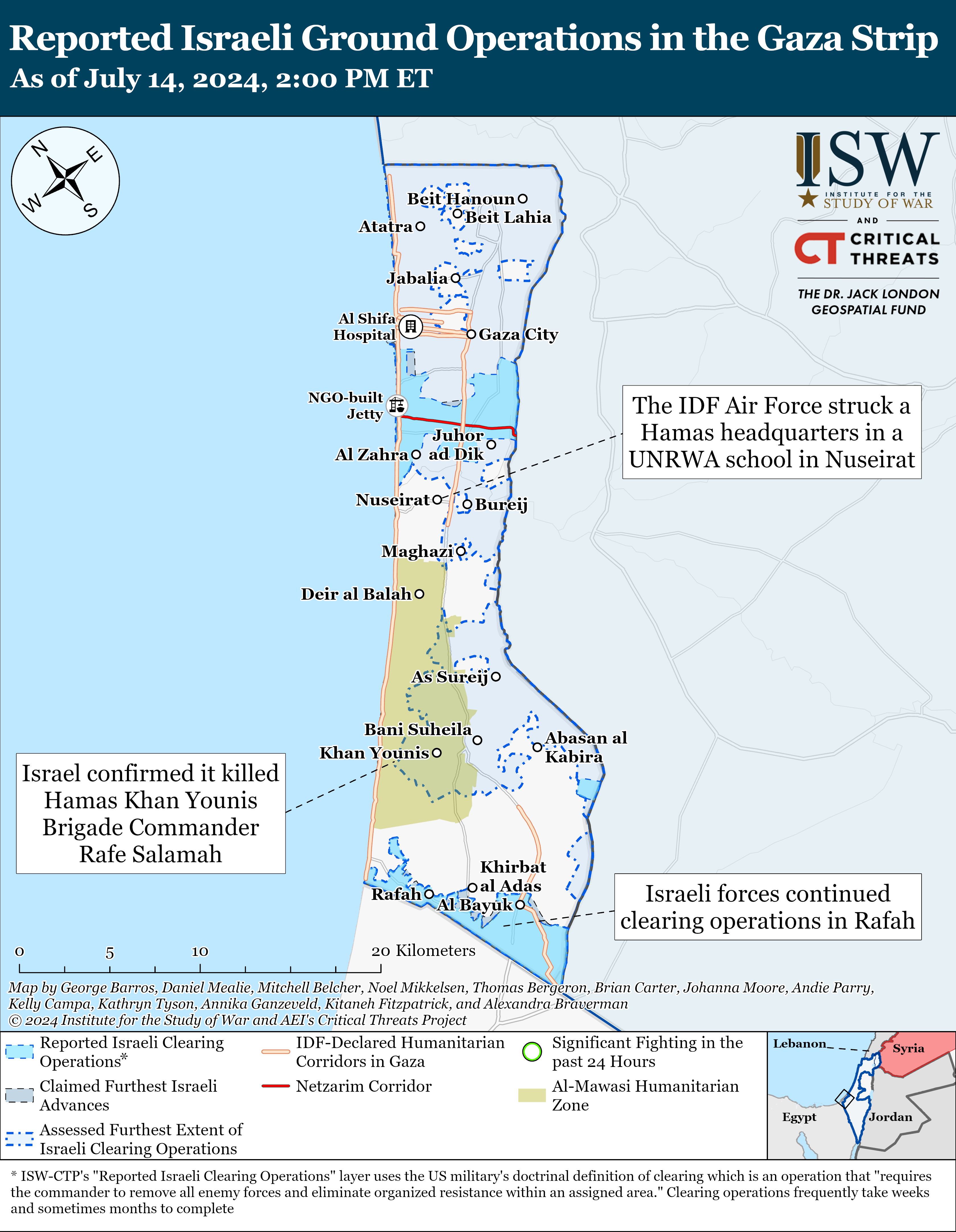 The IDF 162nd Division continued clearing operations in Rafah on July 14. The IDF Nahal Brigade directed airstrikes against an anti-tank guided missile launcher position that Palestinian fighters used to launch guided missiles at Israeli forces.[23] The Nahal Brigade also directed an airstrike targeting a Palestinian fighter cell that posed a threat to Israeli forces.[24] The IDF 401st Brigade destroyed tunnel shafts and militia infrastructure in the Rafah area.[25] Palestinian militias used rockets, mortars, rocket propelled grenades, and small arms to defend against Israeli forces operating in Rafah.[26]