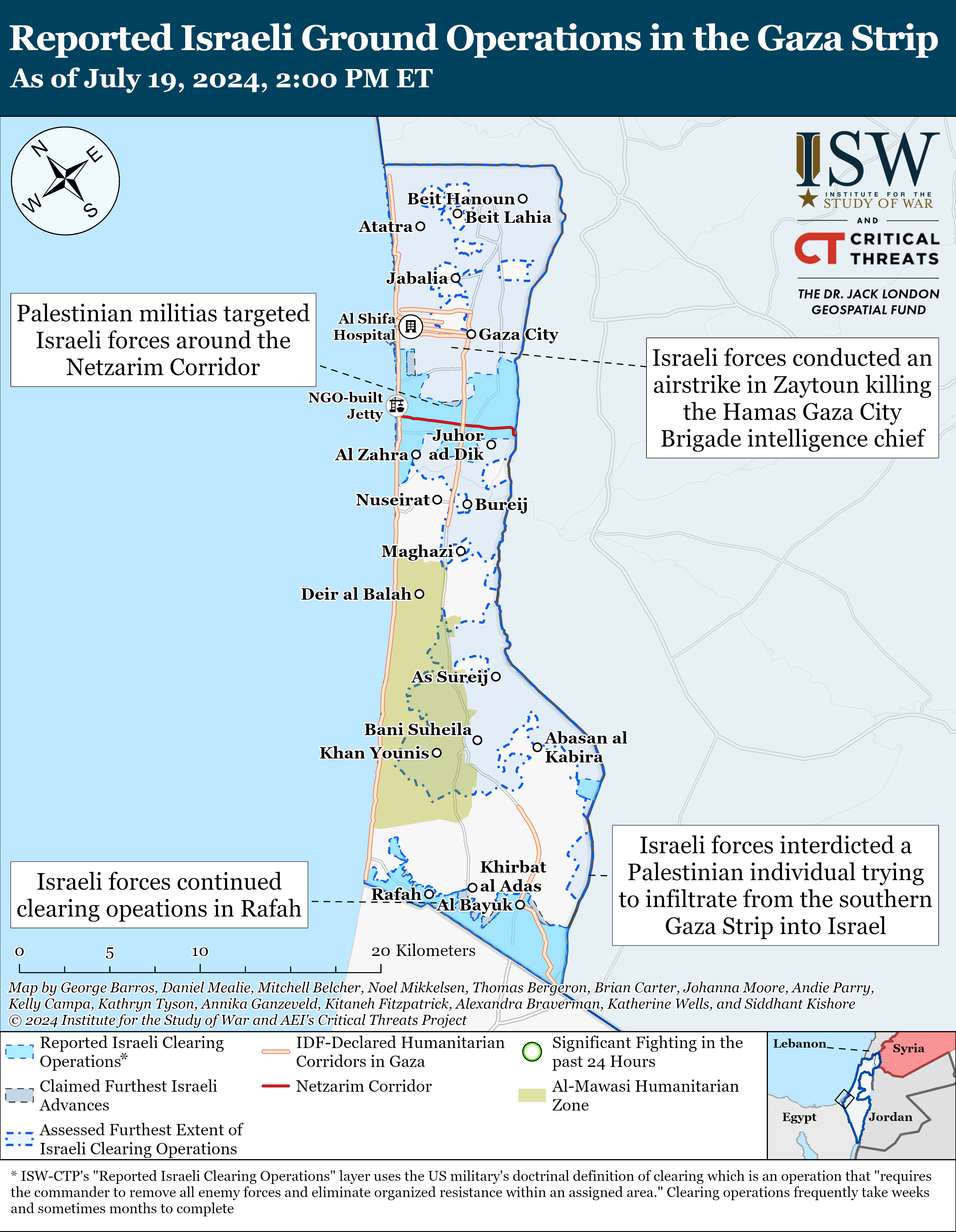 Israeli forces likely continued clearing operations in Rafah on July 19. The IDF did not publish information about its operations in Rafah, and Palestinian militias similarly did not claim attacks targeting Israeli forces in Rafah. Local reports and video published by Israeli soldiers on social media indicate that Israeli forces continued to operate in Rafah along the Philadelphi Corridor, however.[38] The IDF has deployed combat engineers to demolish buildings within 800 meters of the Philadelphi Corridor.[39] An Israeli combat engineer published a video of him demolishing a school near the corridor in southern Rafah on July 19.[40]