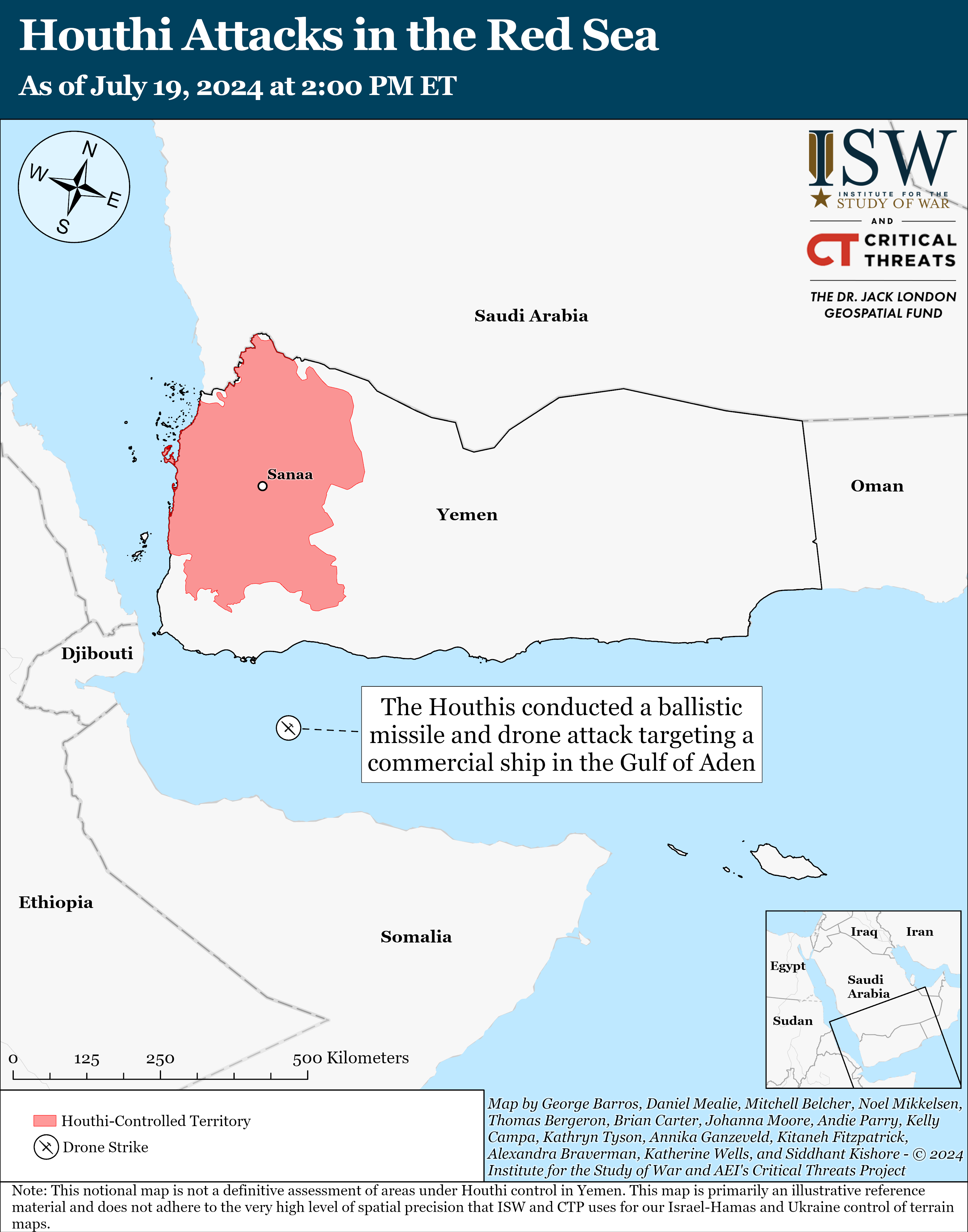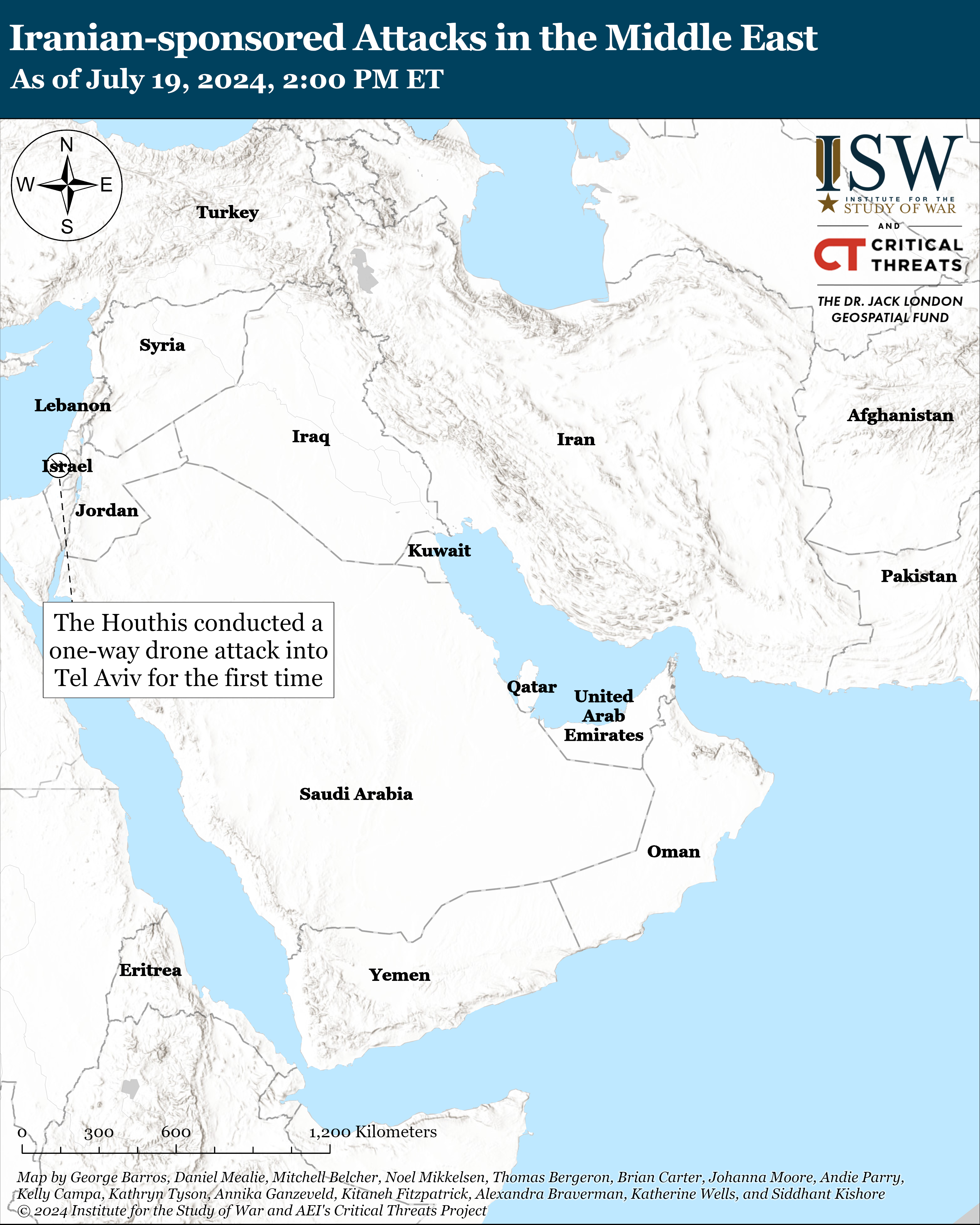 - Yemen: The Houthis launched a one-way attack drone into Tel Aviv for the first time. The Houthis have conducted reconnaissance in force against Israeli air defenses in recent months, which may have enabled the attack.