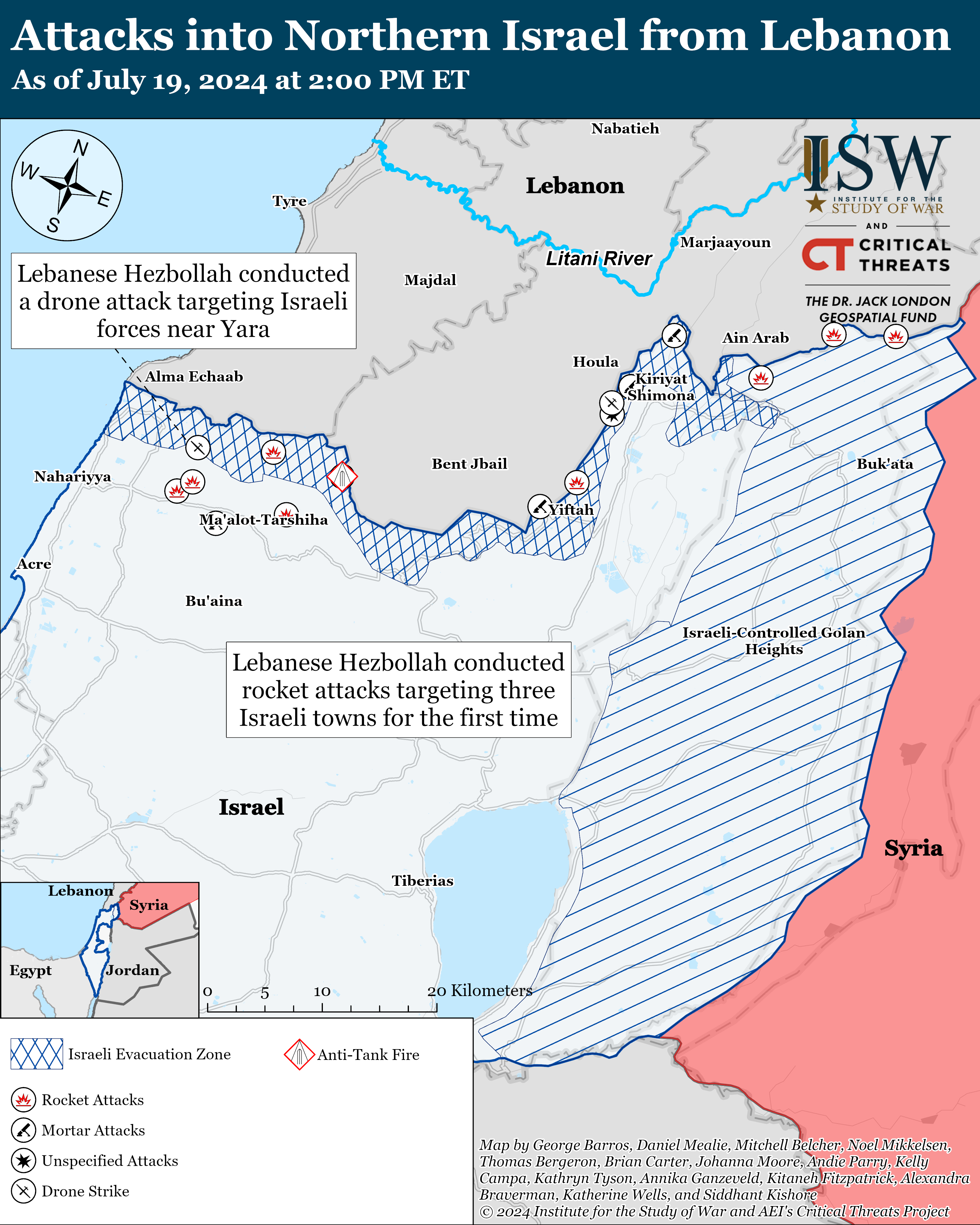 Iranian-backed militias, including Lebanese Hezbollah, have conducted at least 17 attacks into northern Israel since CTP-ISW’s last data cutoff on July 18.[44] The Hezbollah-affiliated Lebanese Resistance Brigades conducted two attacks targeting Israeli forces in northern Israel.[45]