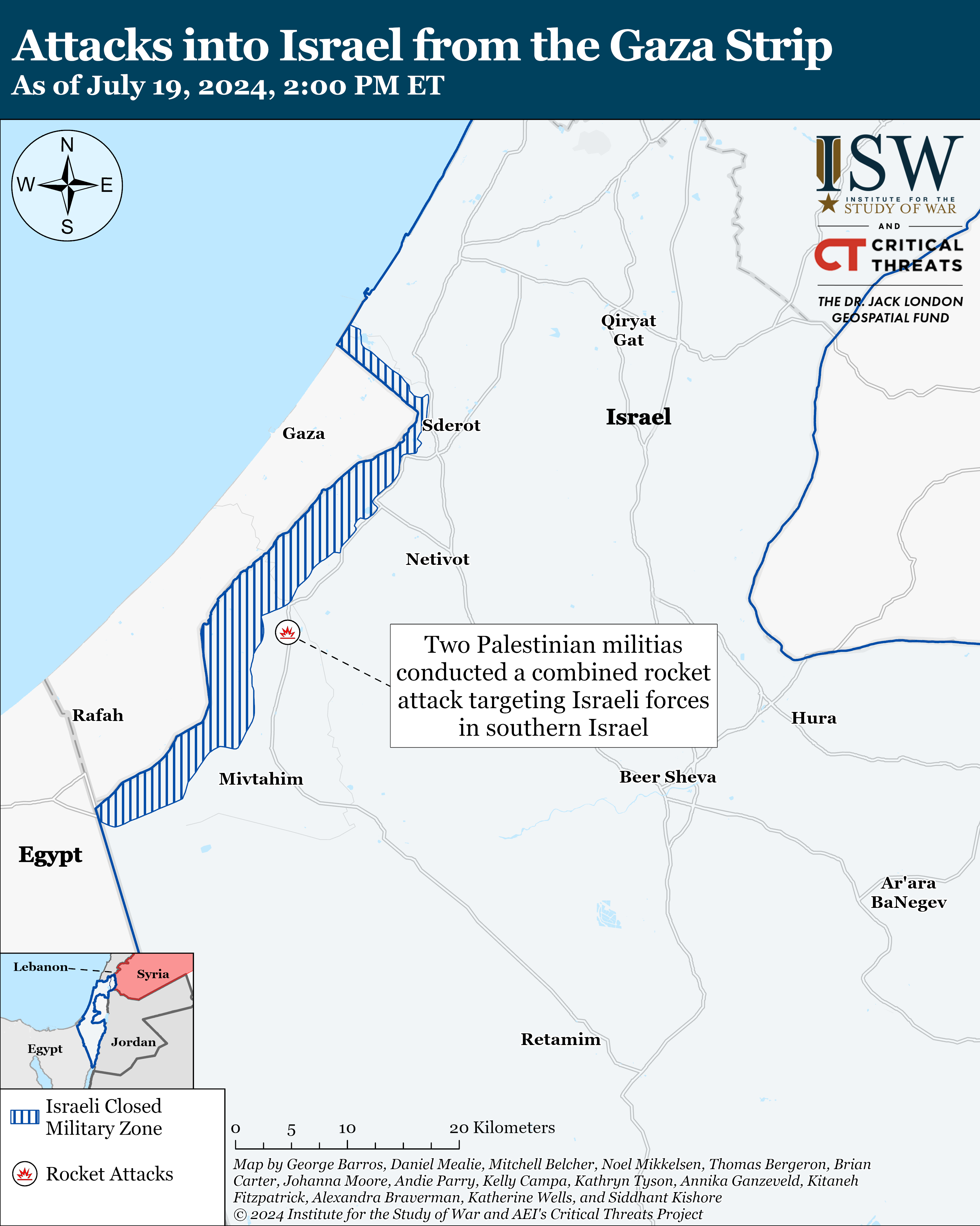 Palestinian militias conducted at least six indirect fire attacks targeting Israeli forces along the Netzarim Corridor on July 19.[37]