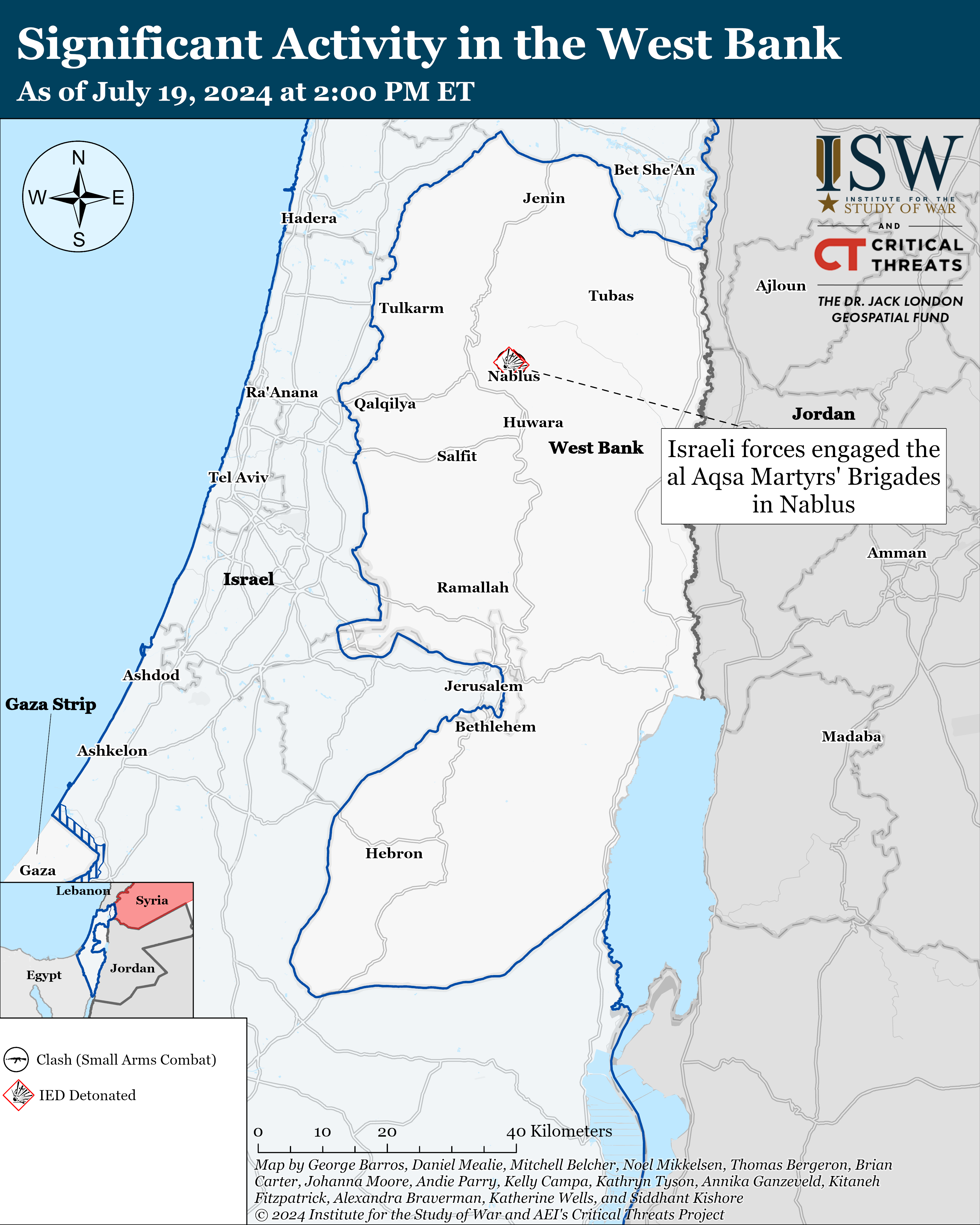 Israeli forces engaged Palestinian fighters in at least two locations in the West Bank on July 19.[42] The al Aqsa Martyrs’ Brigades fired small arms and detonated improvised explosive devices (IED) targeting Israeli forces in Nablus.[43]