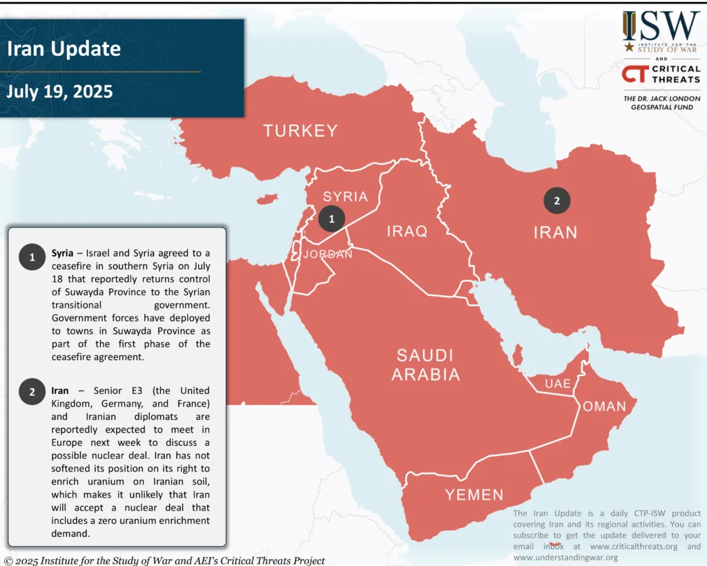 - Israel-Syria ceasefire: Israel and Syria agreed to a ceasefire in southern Syria on July 18 that reportedly returns control of Suwayda Province to the Syrian transitional government. Government forces have deployed to towns in Suwayda Province as part of the first phase of the ceasefire agreement.