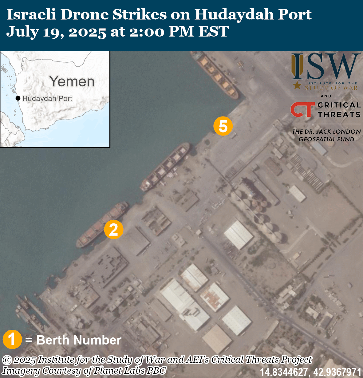 A Yemeni journalist reported on July 21 that Israel’s July 21 airstrikes at Hudaydah Port struck a vessel, a loading vehicle, storage tanks, and repair equipment, including a mobile crane.[78] Satellite imagery captured on July 19 indicated that the Houthis had conducted minor repairs to berth 3 at Hudaydah Port sustained from Israeli strikes on July 6.[79] Commercially available satellite imagery captured on July 21, minutes after the strikes, showed smoke plumes near berths two and five, leaving a crater near berth 5.[80] Israeli airstrikes targeting Hudaydah Port since May 2025 have rendered several berths at the port inoperable.[81] The recent Israeli strikes targeting Houthi repair equipment suggest that Israel aims to hinder the Houthis’ ability to repair these facilities.