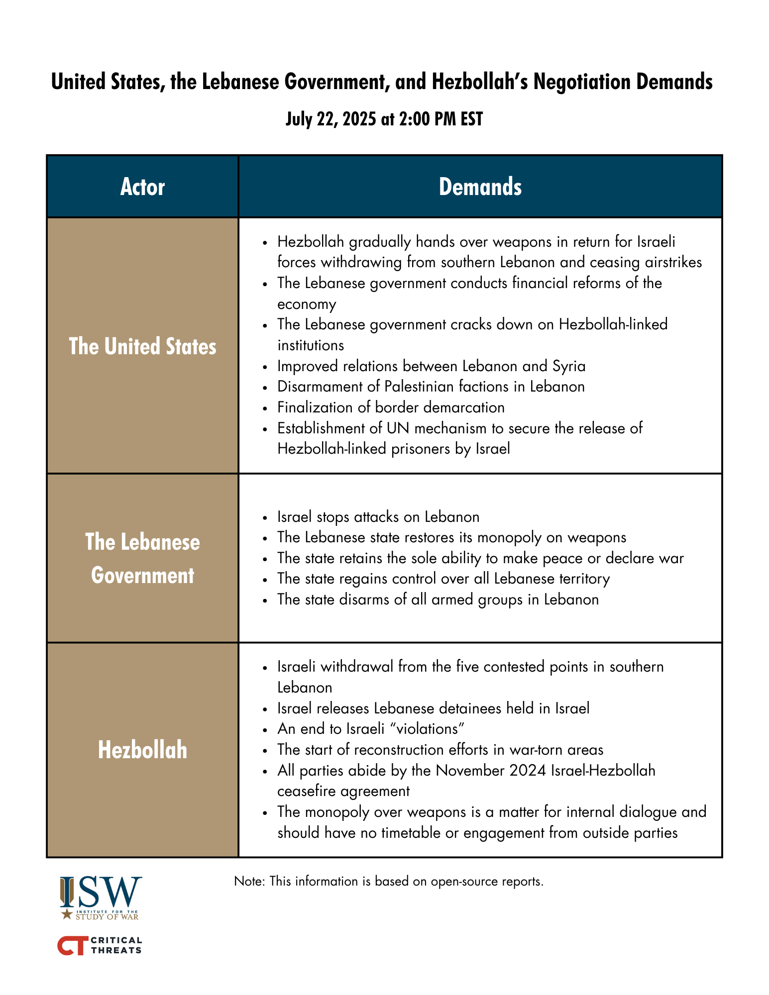 US and Lebanese officials recently met to continue discussing proposals on Hezbollah disarmament.[96] The United States, Lebanon, and Hezbollah continue to disagree over key outstanding issues.[97] US Special Envoy Thomas Barrack, Lebanese Prime Minister Nawaf Salam, Lebanese President Joseph Aoun, and Parliament Speaker Nabih Berri met between June 20 and 22 to discuss the state’s monopoly on violence, Hezbollah disarmament, and the US proposal for Hezbollah disarmament in June.[98] The Lebanese government responded to the US proposal on July 7 with a seven-page document that included its recommendations.[99] It is unclear what the document entailed or what these recommendations were. Aoun gave Barrack a draft comprehensive memorandum on July 21 to gradually implement the return of the state’s monopoly on weapons ”in stages,” which would progress as Israel withdraws from southern Lebanon.[100] Lebanese media reported on July 22 that Berri is also expected to present a proposal to Barrack that will call for Israel to suspend its attacks on Lebanon for 15 days, after which Lebanon would begin a disarmament process.[101] Hezbollah has insisted that Israel must first meet a series of its demands before it will hand over its heavy weapons, however.[102] Hezbollah Secretary General Naim Qassem previously called on July 8 for the implementation of the Taif Agreement, which Lebanese parliamentarians signed in 1989.[103] The Taif Agreement states that Lebanon would be ”taking all the steps necessary to liberate all Lebanese territories from [Israel], to spread state sovereignty over all the territories.”[104] This includes the Israeli-controlled Shebaa Farms, in Hezbollah’s view.[105] Hezbollah is also exempt from the Taif Agreement’s requirement for militia disarmament because Hezbollah argues that it is a unique exception and must retain its weapons to resist Israel.[106]