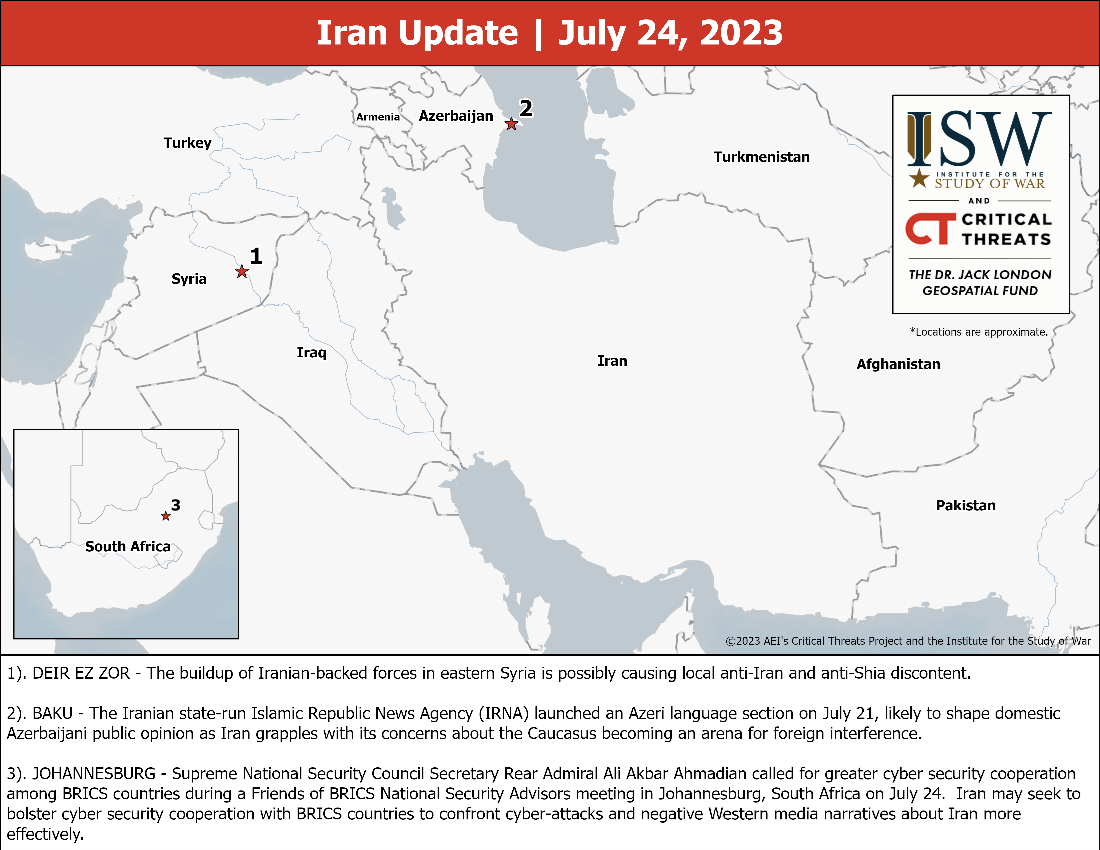 - Supreme National Security Council Secretary Rear Admiral Ali Akbar Ahmadian called for greater cyber security cooperation among BRICS countries during a Friends of BRICS National Security Advisors meeting in Johannesburg, South Africa on July 24. Iran may seek to bolster cyber security cooperation with BRICS countries to confront cyber-attacks and negative Western media narratives about Iran more effectively.
