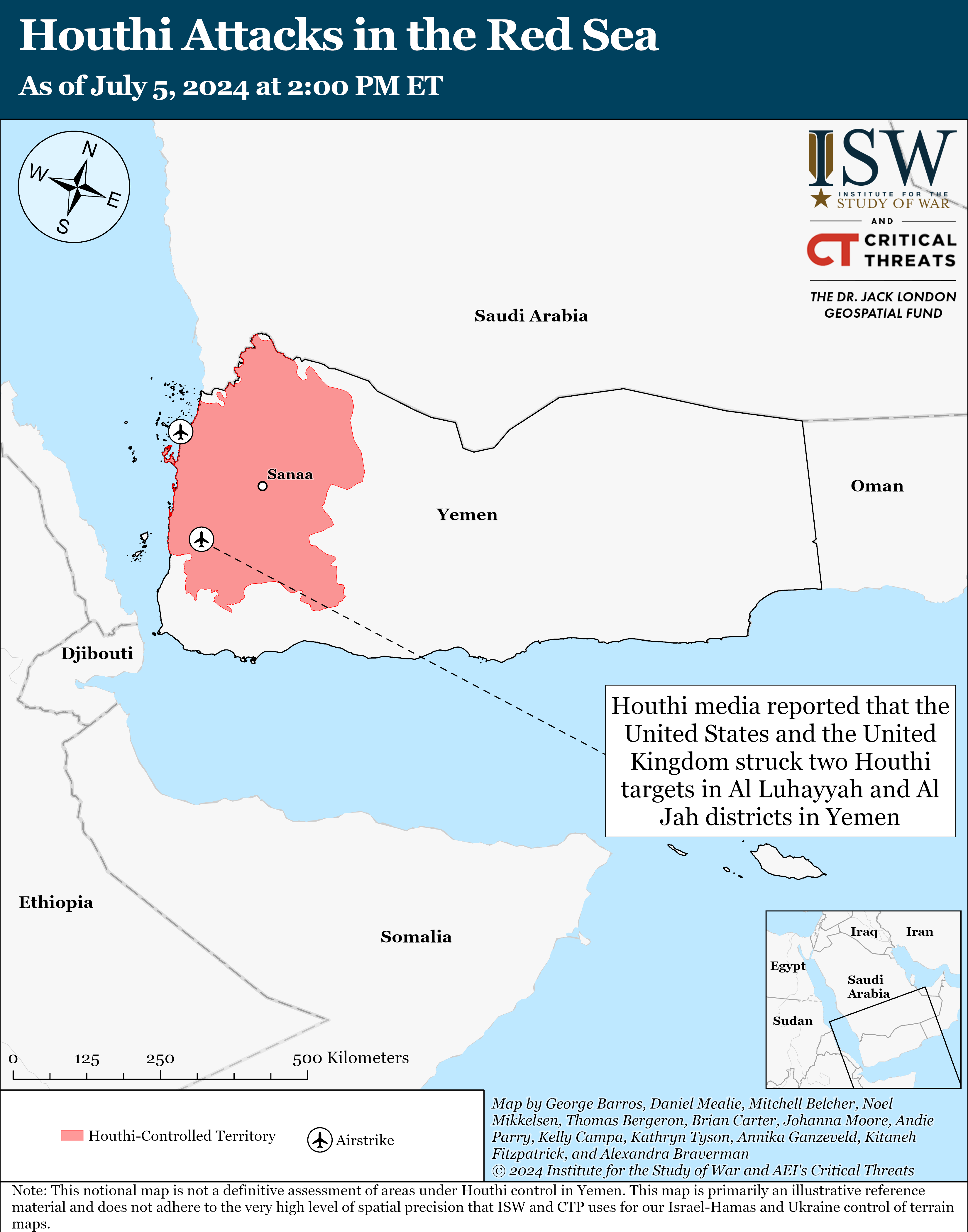 Iran held the second round of its presidential election between ultraconservative hardliner candidate Saeed Jalili and moderate candidate Masoud Pezeshkian on July 5.[11] The Iranian Election Headquarters extended the voting deadline from 1800 to 0000 local time, likely to try to increase voter turnout.[12] This action is not unprecedented; the regime has previously extended voting hours during both presidential and parliamentary elections, including during the June 28 first-round presidential election.[13] The Interior Ministry will likely announce the final election results in the morning local time on July 6. CTP-ISW will publish an analysis of the results on July 6.
