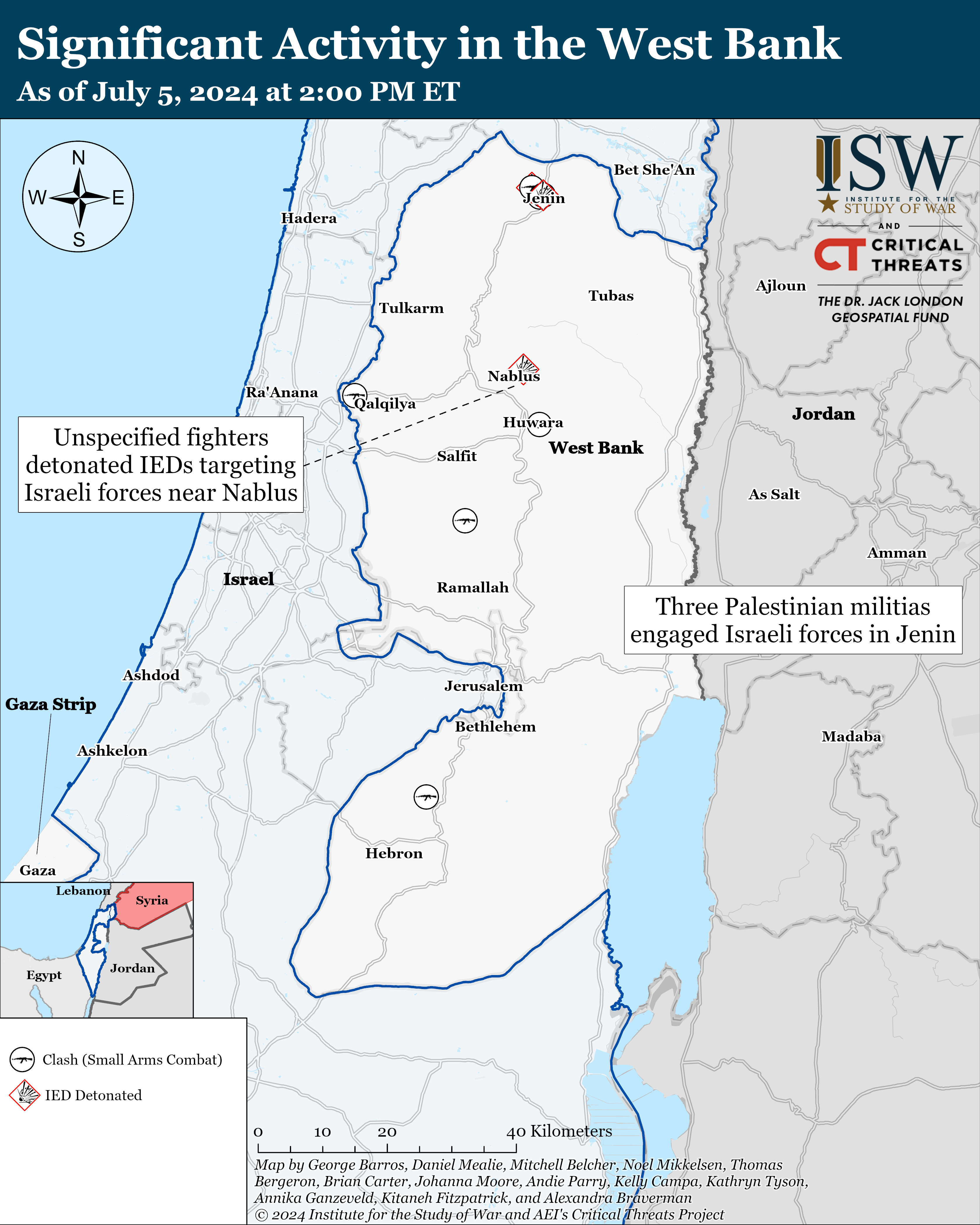Israel conducted a raid targeting Palestinian fighters in Jenin on July 5. The IDF raided a building in Jenin and engaged Palestinian fighters in the area.[32] The IDF killed seven fighters during the raid, including two PIJ fighters responsible for an IED attack that killed an IDF captain and wounded 16 other soldiers in Jenin on June 27.[33] The IDF killed a third PIJ fighter on July 3 who had been involved in the June 27 attack in Jenin.[34] Hamas mourned the three of its fighters killed during the raids on July 5.[35] The IDF also conducted a drone strike targeting fighters in Jenin.[36] Hamas, Palestinian Islamic Jihad (PIJ), and the al Aqsa Martyrs’ Brigades conducted separate small arms and improvised explosive device (IED) attacks targeting Israeli forces in Jenin.[37]