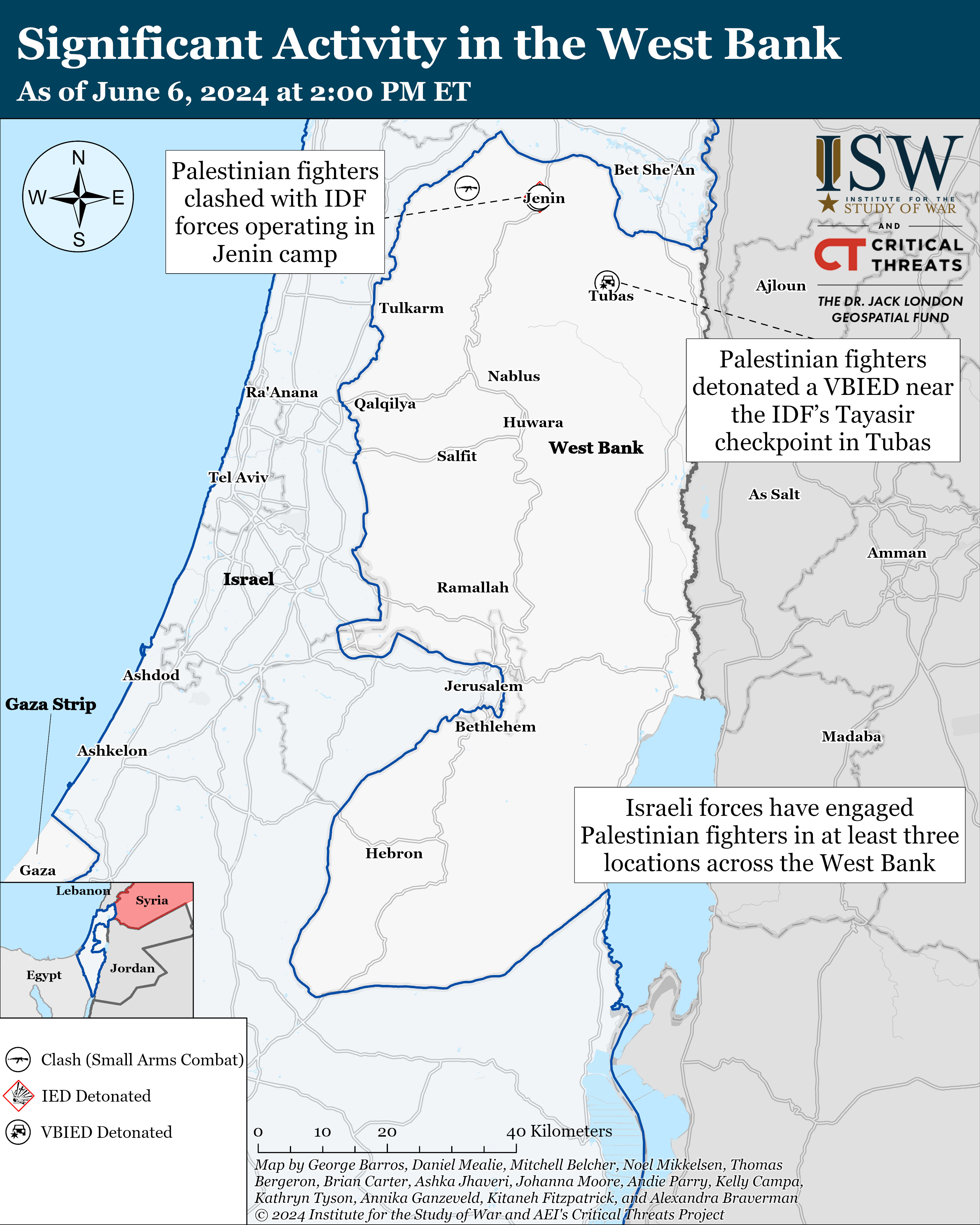 Israeli forces have engaged Palestinian fighters in at least three locations in the West Bank since CTP-ISW’s last data cut off on June 5.[86] Palestinian fighters engaged Israeli forces operating in Jenin camp with small arms and detonated IEDs on June 6.[87] Israeli media reported an IDF helicopter opened fire on Palestinians in Jenin and injured eight people.[88] The IDF confirmed that its units used a helicopter to assist them in detaining a Palestinian suspect in Jenin.[89]