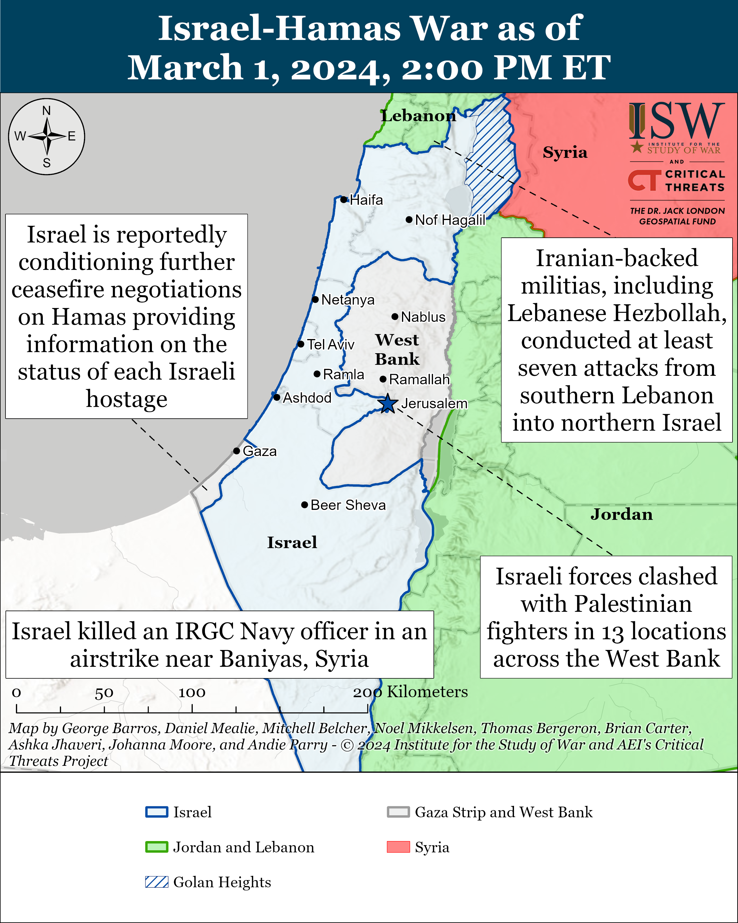 Note: CTP and ISW have refocused the update to cover the Israel-Hamas war. The new sections address developments in the Gaza Strip, the West Bank, Lebanon, and Syria, as well as noteworthy activity from Iran’s Axis of Resistance. We do not report in detail on war crimes because these activities are well-covered in Western media and do not directly affect the military operations we are assessing and forecasting. We utterly condemn violations of the laws of armed conflict and the Geneva Conventions and crimes against humanity even though we do not describe them in these reports.