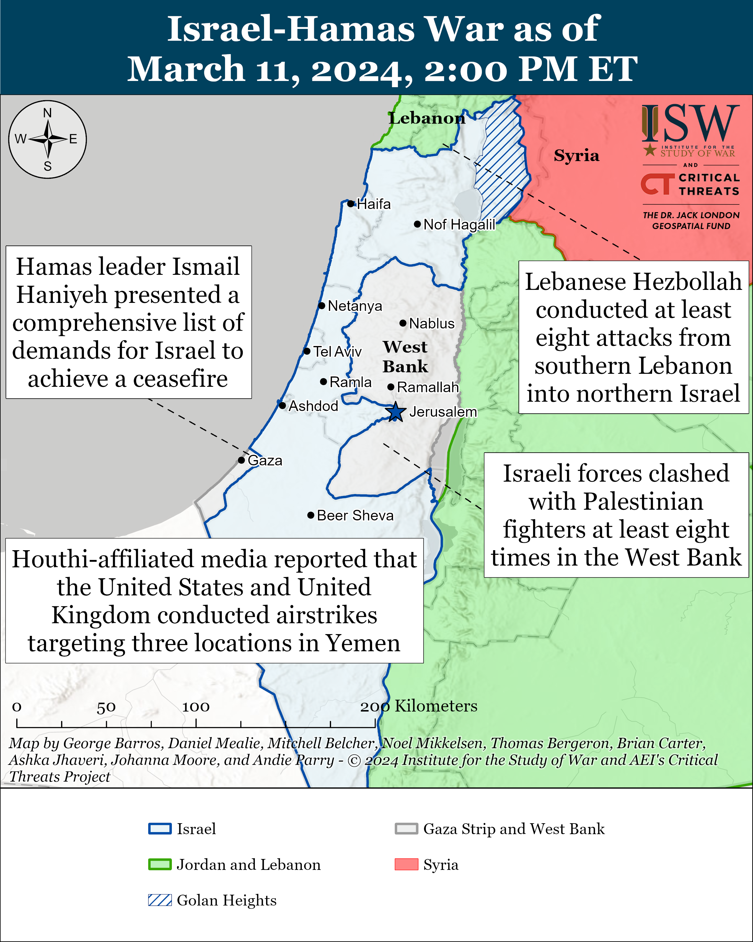 Palestinian militias claimed only one attack targeting Israeli forces around Khan Younis on March 11. The Democratic Front for the Liberation of Palestine (DFLP), which is a leftist Palestinian militia aligned with Hamas in the war, targeted Israeli armor with an IED in Hamad.[17]